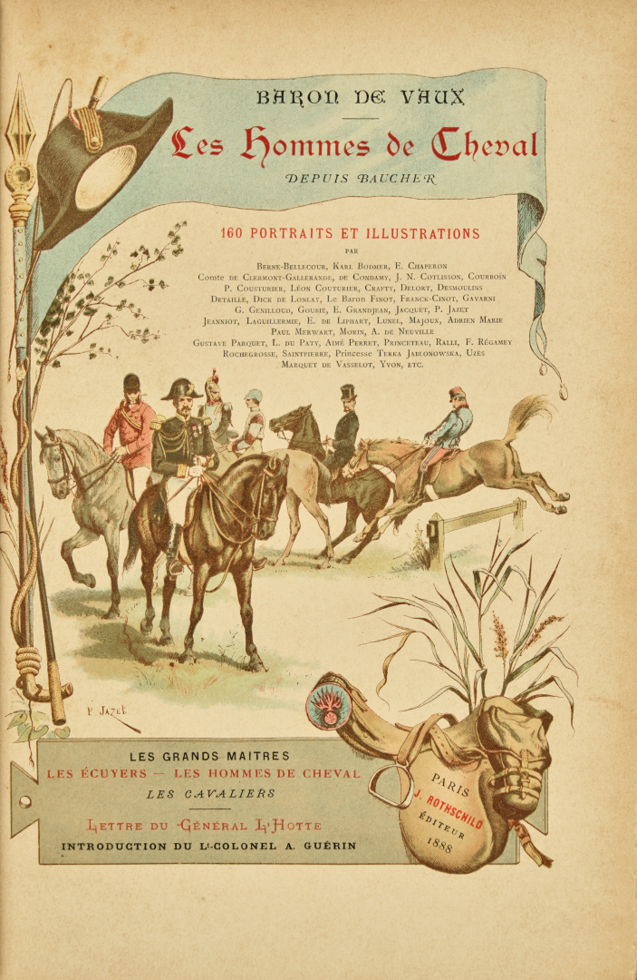 Esemplare con barbe di questa prima edizione. Sono compresi anche Trattato intorno alla cura de' mali interni ed esterni del bestiame del 1793, un esemplare con barbe della Breve esposizione di alcuni precetti sull'arte dell'equitazione da proporsi alle donne del 1827 entro legatura editoriale a stampa, e Sulla ricognizione dell'età dei cavalli tratta dai denti di G. Plessina del 1830, sempre in legatura editoriale in cartoncino a stampa. Completano il lotto Les hommes de cheval del barone Charles de Vaux nell'edizione di Parigi di Fischbach e Rothschild del 1888 con 160 illustrazioni, a piena pagina, entro legatura coeva in mezzo marocchino color nocciola con angoli e fregi dorati al dorso e il Concurso hipico internacional di San Sebastian del 1914.