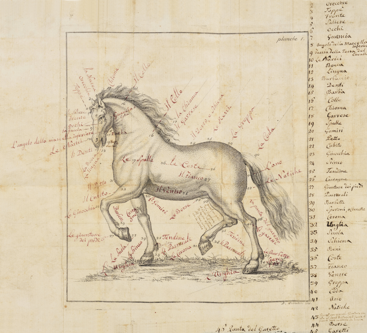 [Cavalli]. Manoscritto anonimo di fine secolo XIX in formato 8° (165 x 110 mm) in inchiostro bruno di 6 carte. Grande incisione di un cavallo ripiegato più volte in fine volume con indicazione di tutte le parti del corpo del cavallo. Legatura del secolo XX in piena pergamena. Divertente documento che riguarda “quello che vorrà acquistare qualche cavallo per non ingannarsi nell’acquisto”.