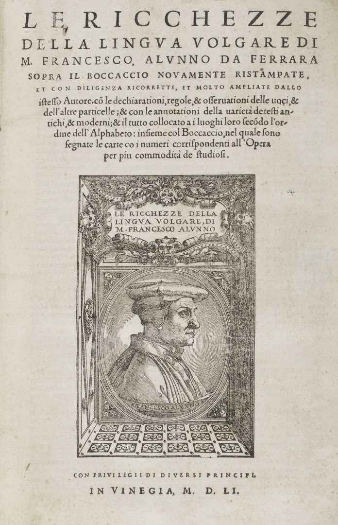 [Cinquecento]. Consistente lotto di cinquecentine di letteratura e lingua italiana. Tra di esse, si segnalano Le ricchezze della lingua volgare di Francesco Alunno, stampate su due colonne dagli eredi di Aldo Manuzio nel 1551, in 2°, con ritratto dell'autore al frontespizio, legatura coeva in pergamena e bella nota di possesso secentesca a fine volume; Orlando furioso di Ariosto, edito da Valgrisi nel 1556 (frontespizio e colophon restaurati), in 8°, con iniziali istoriate, cornici e vignette xilografiche a piena pagina raffiguranti scene del poema; il Libro di novelle et di bel parlar gentile, scritto da Carlo Gualteruzzi e stampato a Firenze nel 1572; Una copia dell'edizione veneziana del 1557 della traduzione Gli elogi. Vite brevemente scritte d'huomini illustri di Paolo Giovio, entro legatura in pergamena con titolo manoscritto e anno al dorso.