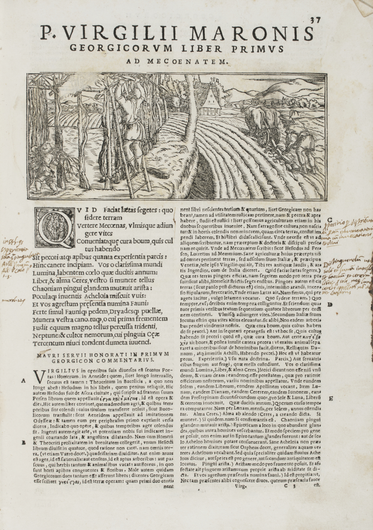 Unica edizione dell'Opera omnia uscita dal tipografo bresciano Britannico. Contiene i commenti di Pierio Valeriano, Étienne Dolet e Maurus Honoratus Servius. Esemplare che reca numerose postille da mano coeva che dimostrano l'analisi dettagliata dell'opera!