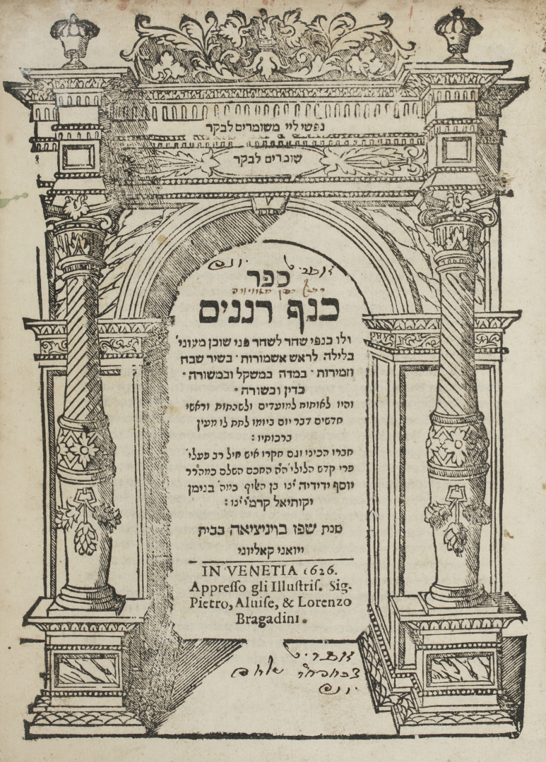 [Judaica]. Carmi, Joseph Jedidiah. Sefer Kenaf renanim. Venezia, Pietro, Alvise e Lorenzo Bragadin, 1626.
