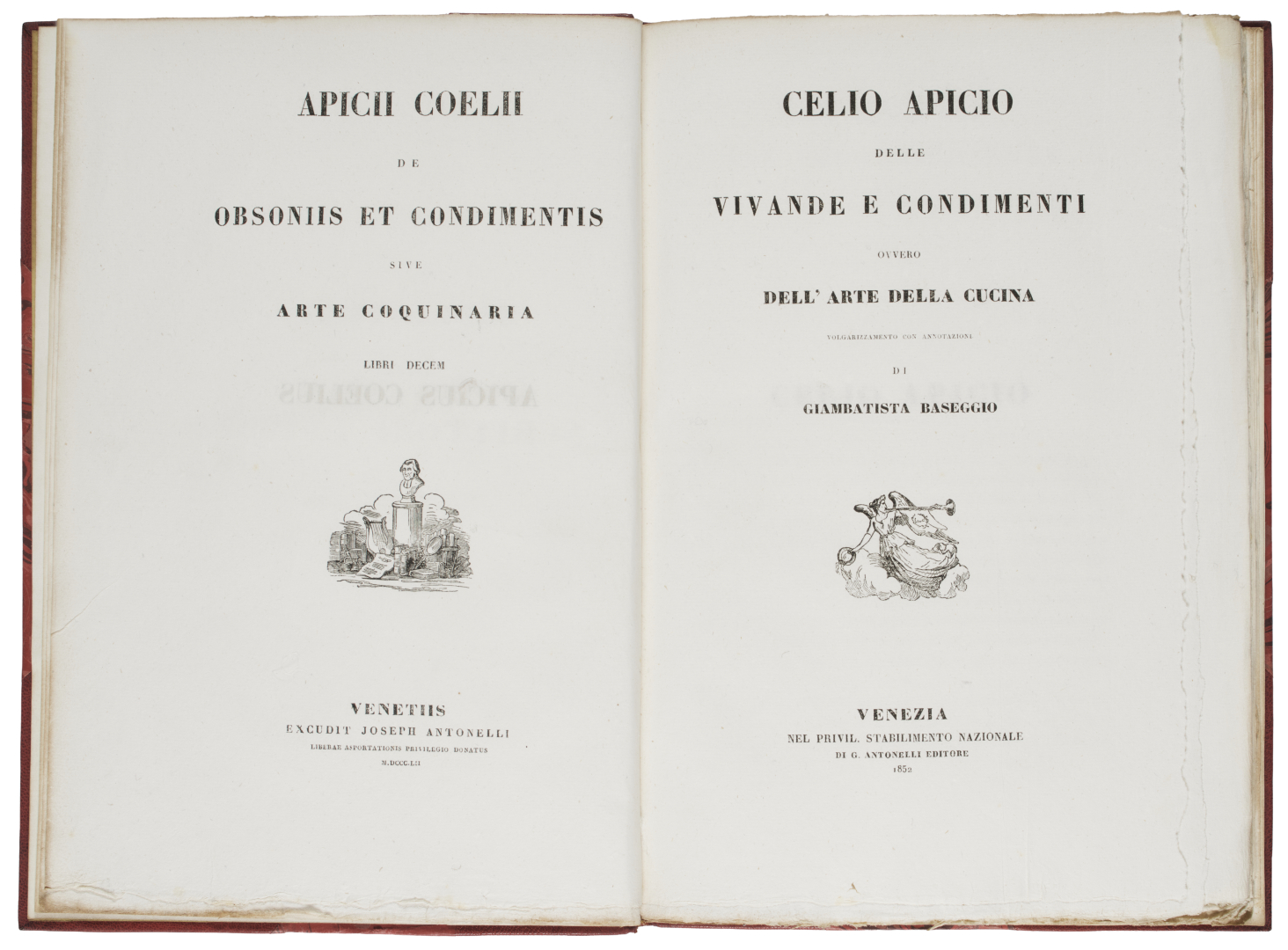 [Culinaria]. Celio Apicio. Delle vivande e condimenti, ovvero Dell'arte della cucina. Venezia, Antonelli, 1852.
