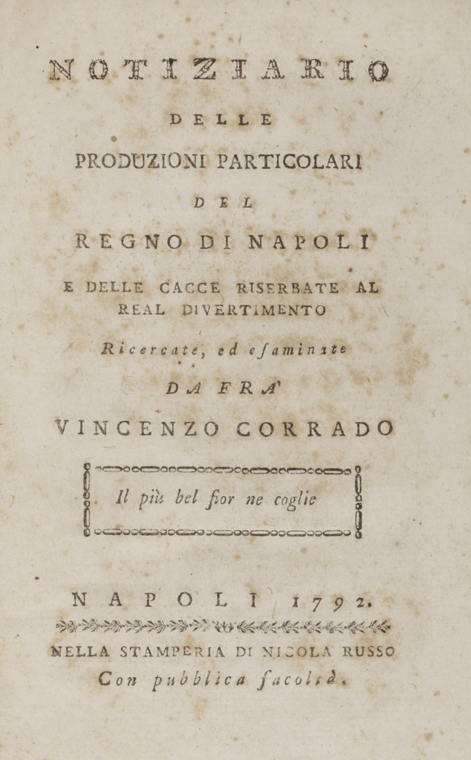 [Culinaria]. Corrado, Vincenzo. Notiziario delle produzioni particolari del Regno di Napoli e delle cacce riserbate al real divertimento ricercate, ed esaminate. Napoli, Nicola Russo, 1792.