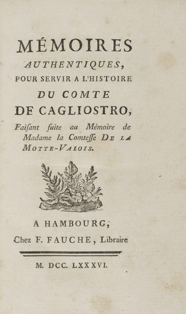 [Curiosa - Cagliostro]. Interessante miscellanea che contiene Mémoires authentiques, pour servir a l'histoire du comte de Cagliostro di Jean-Pierre-Louis de La Roche Du Maine, marquis de Luchet del 1786, Mémoire en forme de lettre pour M. Daudet de Jossan, contre M. Kornman del 1787, Le Public désavouant les libelles atroces répandus sous son nom, contre M. de Beaumarchais, et déclarant ne plus prendre d'intéret au sieur Kornmann del 1787, Réponse de P.A.C. de Beaumarchais, a tous les libellistes et pamphlétistes del 1787, Mémoire de Pierre-Augustin Caron de Beaumarchais contre M. Guillaume Kornman ... accusant sa femme d'adultere del 1787, Lettre intéressante d'un ancien secrétaire de la police, a M. de Beaumarchais del 1787, Observations du sieur Kornmann, sur un écrit signé Séguin et Dubois del 1787, Mémoire pour la dame Kornmann; contre le sieur Guillaume Kornmann, son époux del 1787, e la Confession générale de Pierre-Augustin Caron de Beaumarchais, exécuté au Caveau du Palais-Royal; suivie de la lettre plaintive du sieur Morand ... à notre bourgeois sempre del 1787. Guillaume Kornmann era un banchiere francese la cui causa contro la moglie, una giovane e ricca donna svizzera, sostenuta da Beaumarchais, ebbe particolare risonanza negli anni '80 del Settecento. Quest'ultimo fece rinchiudere la moglie adultera, rimasta incinta del suo amante.
