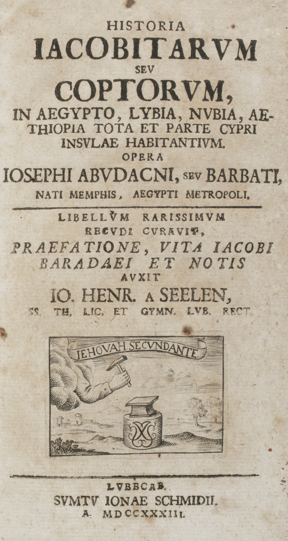 [Curiosa - Copti]. Abudacnus, Historia Jacobitarum, seu Coptorum, 1733 [Curiosa - Copti] Seconda edizione dell'Historia Iacobitarum seu Coptorum, in Aegypto, Lybia, Nubia, Aethiopia tota et parte Cypri insulae habitantium di Joseph Abudacn, stampata a Lubecca da Schmid nel 1773, entro legatura coeva in pergamena con titolo in oro su tassello al dorso. Rara opera sui cristiani copti e sull'eresia monofisita in Egitto, Libia, Nubia, Etiopia e Cipro scritta dall'egiziano Abudacn e curata dal teologo tedesco Johann Heinrich von Seelen.
