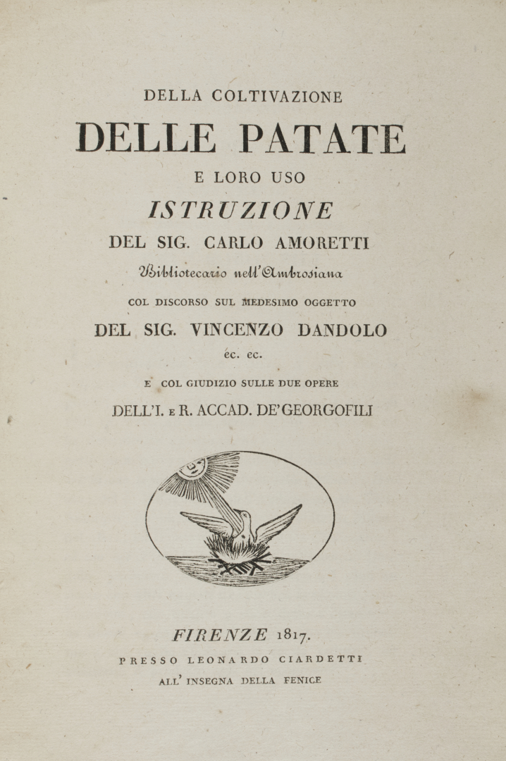 [Curiosa - Patate]. Raro lotto dedicato alla patata: citiamo tra gli altri un esemplare con barbe Della coltivazione delle patate e loro uso istruzione del sig. Carlo Amoretti ... col discorso sul medesimo oggetto del sig. Vincenzo Dandolo del 1817, Dell'utilità ed uso del pomo di terra e del metodo migliore di coltivarlo del dott. Agostino Bassi nell'edizione di Lodi del 1817, Della cultura e dell'uso economico de' pomi di terra detti volgarmente patate di Nicola Onorati del 1803, la Lettera intorno alle patate del signor Antonio Zanon corretta in più luoghi, ed illustrata con note dal dottor N.N. nell'edizione romana del 1785, e un esemplare a fogli chiusi dell'Istruzione sulla coltivazione e sugli usi dei pomi di terra o sia patate nell'edizione di Udine del 1816.