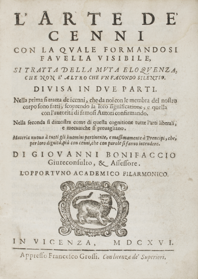 [Curiosa]. Bonifacio, Giovanni. L’ arte de’ cenni con la quale formandosi favella visibile. Vicenza, Francesco Grossi, 1616.