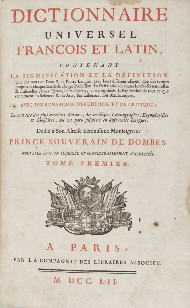[Dizionario]. Il Dictionnaire universel françois et latin vulgairement appellé Dictionnaire de Trévoux nell'edizione di Parigi par la Compagnie des Libraires Associés del 1752 con vignetta al frontespizio stampato in rosso e nero, entro legatura coeva in bazzana con fregi fitomorfi dorati e titolo in oro su doppio tassello al dorso e tagli rossi. Il Dictionnaire de Trévoux è un'opera di consultazione francese del XVIII secolo, inizialmente pubblicata nella città di Trévoux dai membri dell'ordine dei Gesuiti. I due principali curatori, i gesuiti Tournemine e Claude Buffier, presentano la posizione cattolica nei confronti del giansenismo, soprattutto negli articoli riguardanti la teologia e la filosofia.