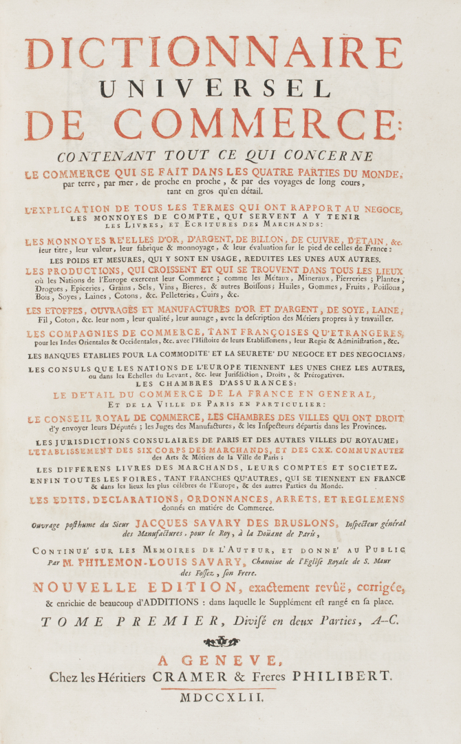 [Economia]. Bell'esemplare del Dictionnaire universel de commerce di Jacques Savary des Brûlons nell'edizione di Ginevra di Cramer e Frères Philibert del 1742 con frontespizio stampato in rosso e nero, entro legatura coeva in bazzana con fregi dorati e titolo su doppio tassello al dorso e tagli rossi. Importante pubblicazione "contenant tout ce qui concerne le commerce qui se fait dans les quatre parties du monde". L'autore fu ispettore generale delle dogane a Parigi, e per proprio uso, iniziò a compilare un quaderno con un elenco di termini legati al commercio e all'industria abbinati a definizioni. Questa lista divenne sempre più corposa e sorse l'idea di trasformare questi appunti in un vero e proprio dizionario.