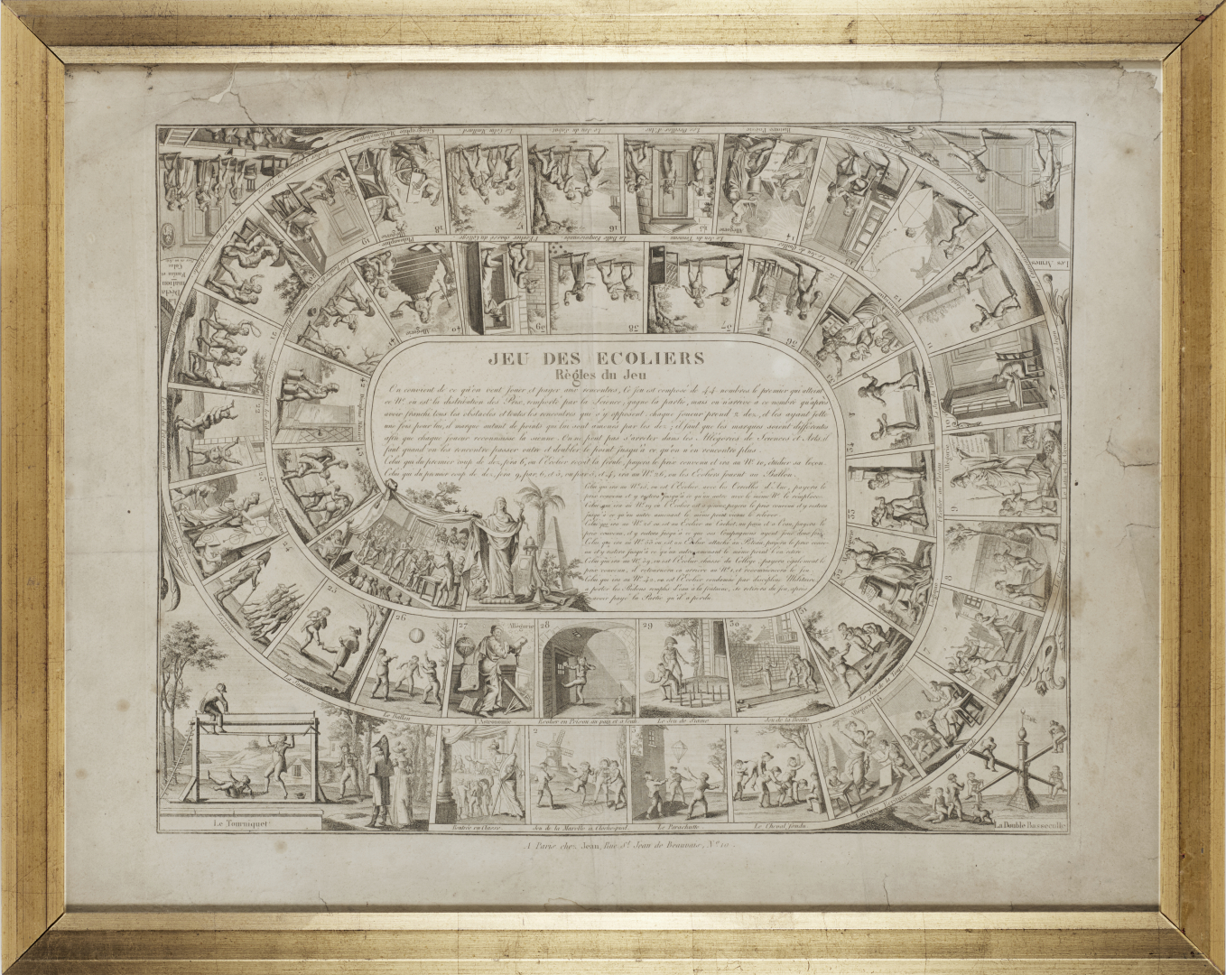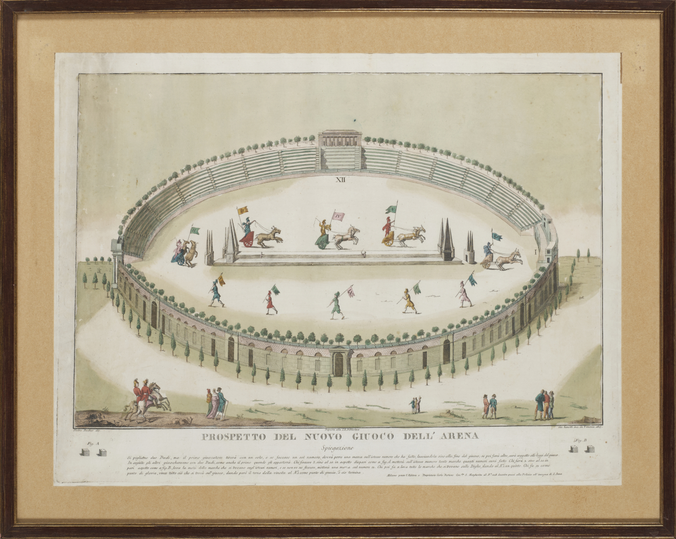 [Gioco ai dadi]. Prospetto del nuovo giuoco dell'Arena (510 x 640 mm). Acquaforte stampata a Milano da Carlo Bertone nel 1817, con coloritura coeva, entro passe-partout e cornice moderna. Nel lotto anche Jeu des ecoliers, stampato a Parigi da Jean nel 1810 circa. Si tratta di un gioco di 44 caselle numerate, spirale, antiorario, centripeto. Il percorso si sviluppa dal rientro in classe, con raffigurata Minerva alla distribuzione dei premi. Ciompi & Seville 2332.