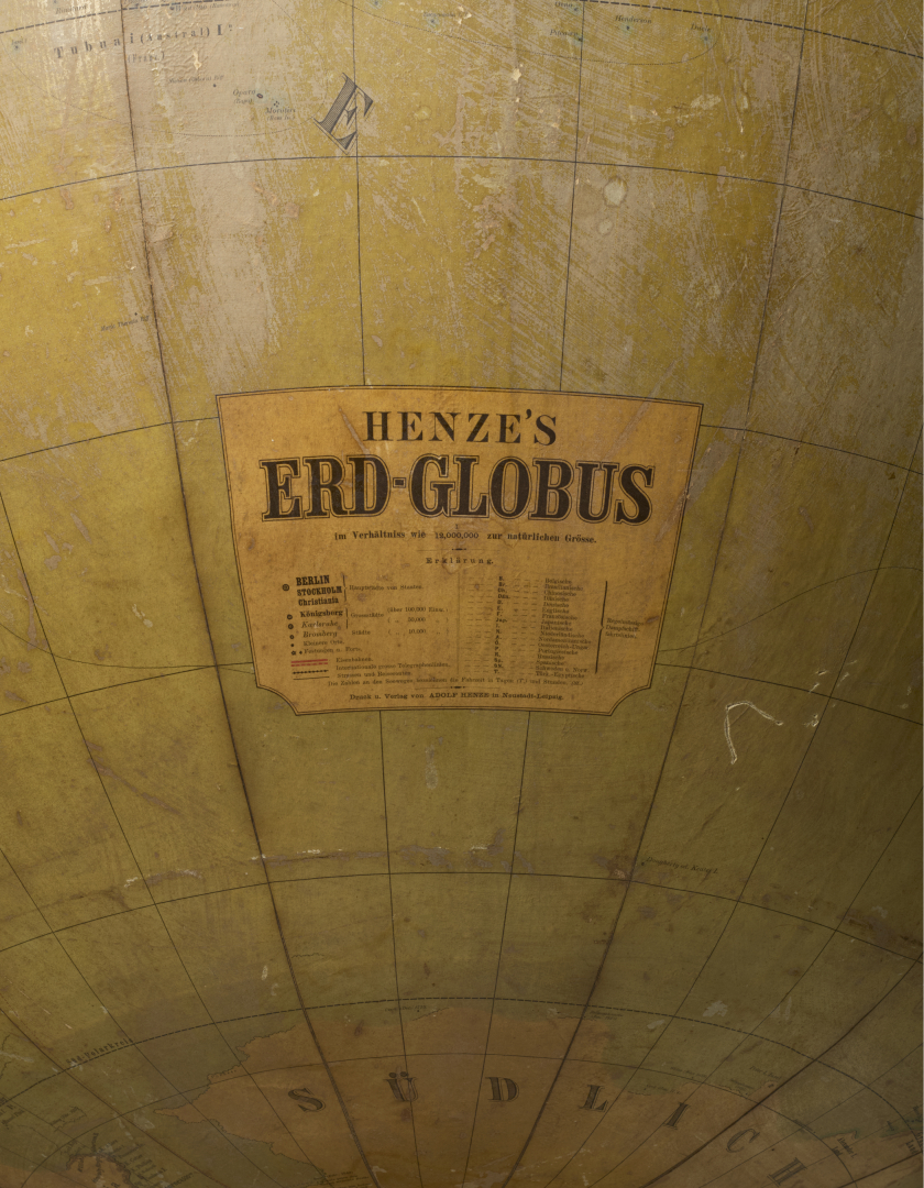 [Globo]. Rarissimo grande globo da biblioteca di Adolf Henze (1814-1883) del 1889 circa, pubblicato come il più grande globo commerciale mai realizzato. Adolf Henze era un editore tedesco del periodico "Illustrierter Anzeiger für Contor und Bureau". Per incoraggiare gli abbonamenti, includeva spesso supplementi gratuiti come mappe e tabelle di conversione. Tra il 1885 e il 1890, gli abbonati potevano collezionare 24 semisfere stampate e due calotte polari per il monumentale Erd-Globus di Henze, dal diametro di 106 cm. A pagamento, chi possedeva un set completo poteva richiedere un kit di montaggio pneumatico o far montare il globo da un professionista su due emisferi uniti e una base a piedistallo. Il globo reca il cartiglio Henze's Erd-Globus im Verhältniss wie 1:12.000.000 natürlichen Grösse. Druck u. Verlag von Adolf Henze a Neustadt-Lipsia. Si presenta montato come fornito dall'editore su due emisferi, fissati con quattro giunti a vite, asse centrale sostenuto da supporto in legno, altezza di 175 cm e 106 cm di diametro (manca il pomello in alto, piccole mancanze e difetto in alto). Verosimilmente uno dei pochissimi esemplari sopravvissuti.