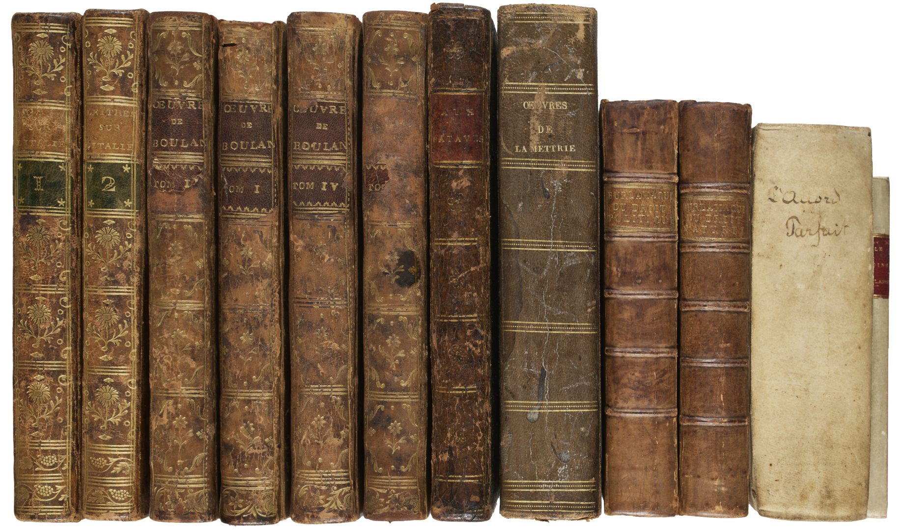 Prima edizione di questa relazione in 115 lettere di un viaggio che comprende soggiorni a Genova, Firenze, Roma e Napoli, fatta del magistrato e presidente del Parlamento di Bordeaux Dupaty (1746-1788). Nel lotto anche Principes du droit naturel di Burlamaqui del 1748, Oeuvres complettes di Boulanger del 1775 in quattro volumi, Aux Bataves sur le Stathouderat di Mirabeau del 1788, Principes du droit politique di Rousseau del 1751 con 2 tomi in 1 volume, Oeuvres philosophiques de La Mettrie del 1796, L'accord parfait del 1755 con 2 tomi in 1 volume, e Le moine secularisé nell'edizione di Cologne del 1678.