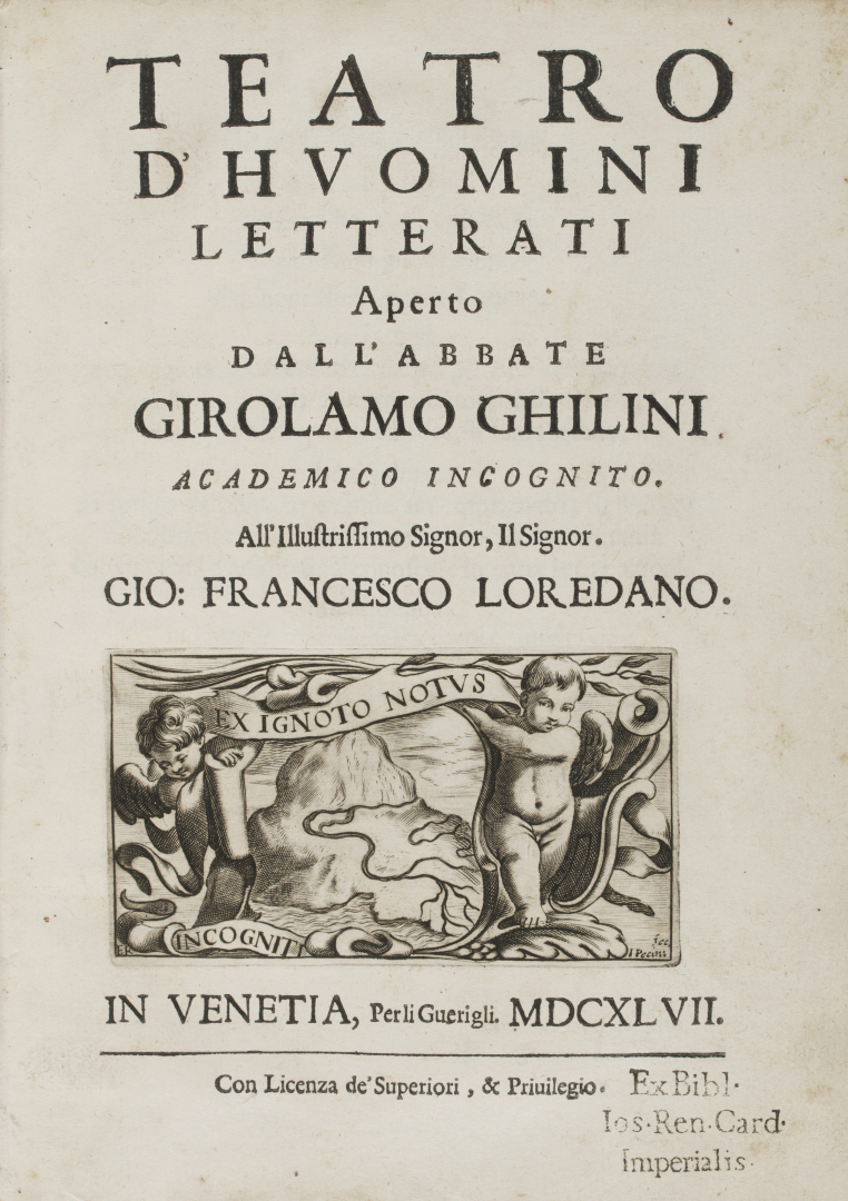 [Imperiali]. Lotto che contiene la seconda edizione del Teatro d'huomini letterati di Girolamo Ghilini nell'edizione veneziana di Guerigli del  con grande vignetta incisa in rame al frontespizio, entro legatura coeva in pergamena con titolo in oro su tassello al dorso, e recante un ex libris nobiliare e il timbro del cardinale Giuseppe Renato Imperiali, noto per la sua grande la biblioteca che comprendeva più di 15.000 volumi, con una prevalenza di testi di diritto, filosofia e letteratura.