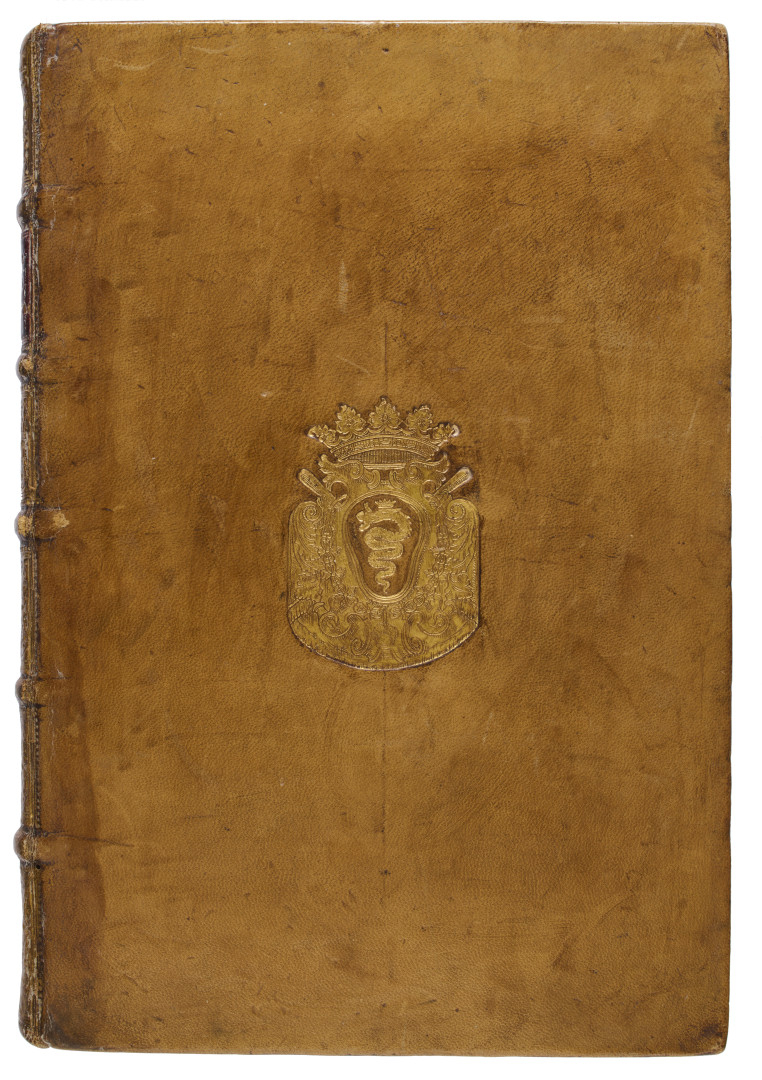 In 2° (280 x 190 mm); [8], 216, [8] pagine. Antiporta allegorica incisa, 1 ritratto inciso e ripiegato, 1 albero genealogico ripiegato (rinforzo all'antiporta, albero genealogico staccato e strappi restaurati.) Legatura coeva in vitellino biondo con supra libros dei Visconti, fregi e titolo in oro al dorso, tagli e labbri in oro. Antiche note di possesso, timbro del pittore milanese Agostino Caironi (1820-1907).
