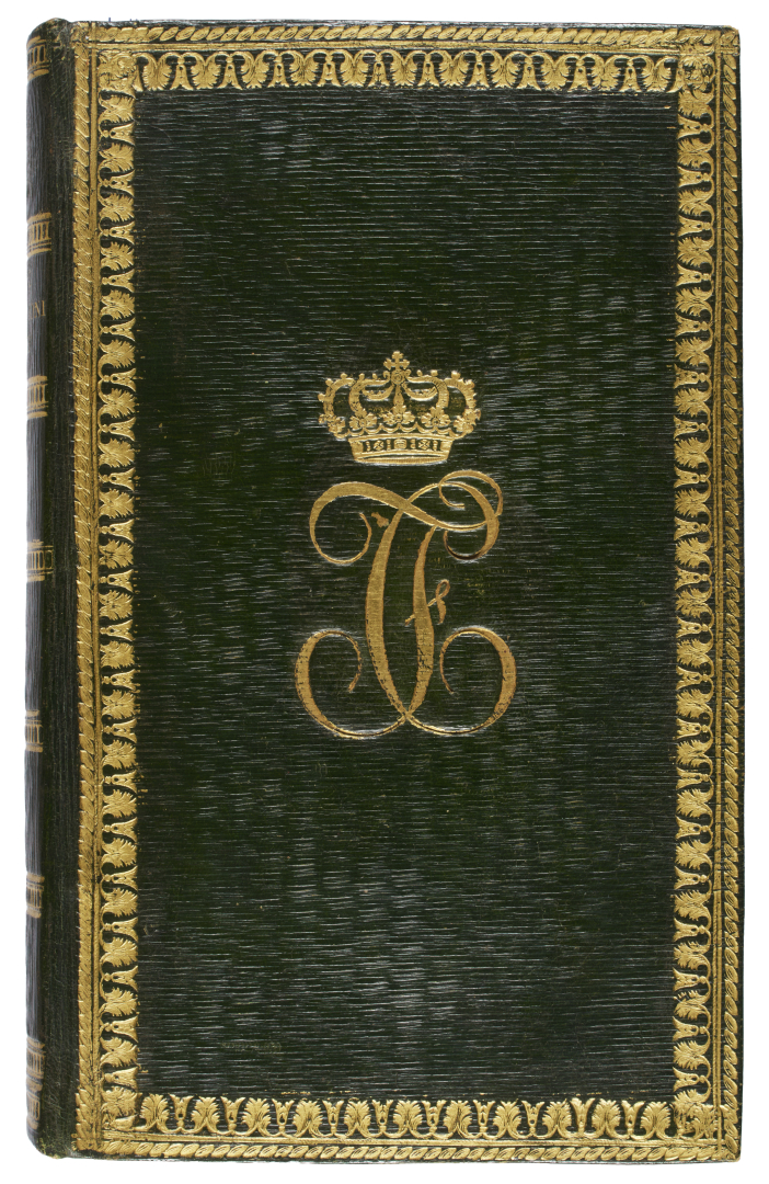 [Legatura - Savoia]. Legatura alle armi di Carlo Felice di Savoia, marito di Maria Cristina di Borbone-Due Sicilie, re di Sardegna (1765-1831) in marocchino verde con monogramma al piatto anteriore, stemma a quello posteriore, cornice fitomorfa, labbri e tagli in oro, che contiene Della maniera di fondare dirigere e conservare un Istituto balneo-sanitario con osservazioni cliniche induttive sopra molte malattie che vennero preferibilmente curate con soccorsi balnearj a seconda della nuova dottrina medica da Pietro Paganini del 1822.