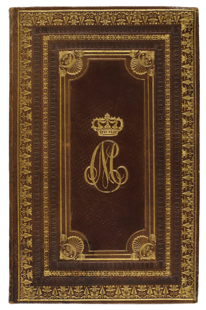 [Legatura - Savoia]. Legatura di dedica alle armi di Maria-Cristina di Borbone-Due Sicilie, regina di Sardegna, moglie di Carlo Felice di Savoia (1779-1849) in marocchino color nocciola con ricca decorazione in oro ai piatti e al dorso (273 x 175 mm). Contiene Dante in Ravenna Dramma del marchese Luigi Biondi nell'edizione torinese di Chirio del 1837.