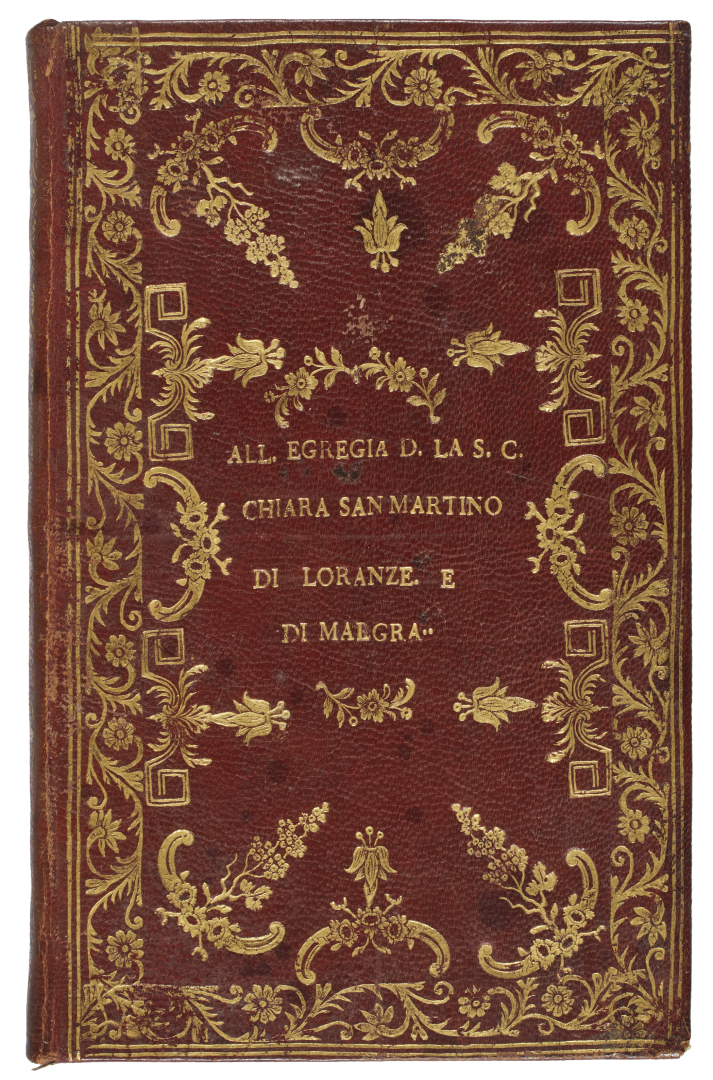 [Legatura]. Graziosa legatura della seconda metà del secolo XVIII (205 x 132 mm) in marocchino bordeaux, completamente decorata con fregi fitomorfi con dedica alla contessa Chiara San Martino al piatto anteriore, che contiene La morte di Socrate nell'edizione torinese della Stamperia Soffietti, a spese di Bernardino Tonso mercante libraio vicino alla Chiesa della Trinità, stampata tra il 1749 e 1811.