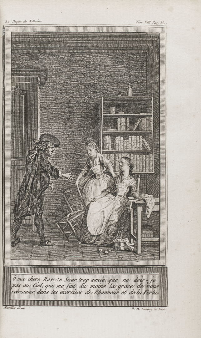 [Legatura]. Legatura [Legatura] Legatura d'amatore di inizio secolo XIX in marocchino rosso con supra libros nobiliare, fregi e titolo al dorso, unghiatura à dentelles, ex libris con motto "Bona Fide Sine Fraude" e tassello della libreria antiquaria Il Polifilo, Milano, che contiene Le Doyen de Killerine, Histoire Morale dell'abbé Prevost nell'edizione di Parigi del 1808 con 6 tavole incise in rame di Marillier.