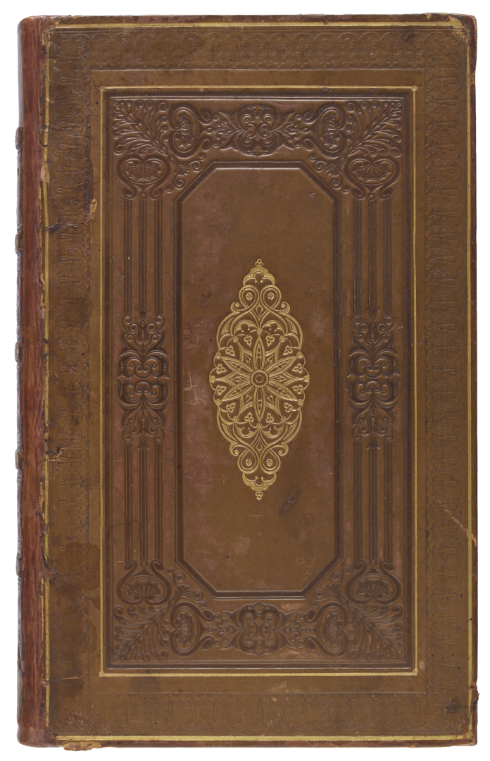 [Legatura]. Legatura del secolo XIX in vitellino color nocciola con ricca decorazione a secco ed in oro ai piatti (dorso anticamente rifatto) che contiene un esemplare molto marginoso de Le prose e poesie campestri d'Ippolito Pindemonte con l'aggiunta d'una dissertazione su i Giardini inglesi e sul merito in ciò dell'Italia nell'edizione veronese di Mainardi del 1817. Nel lotto anche Narcisa Romanzo in quattro canti di C. Tedaldi-Fores nell'edizione milanese di Batelli e Fanfani del 1818.