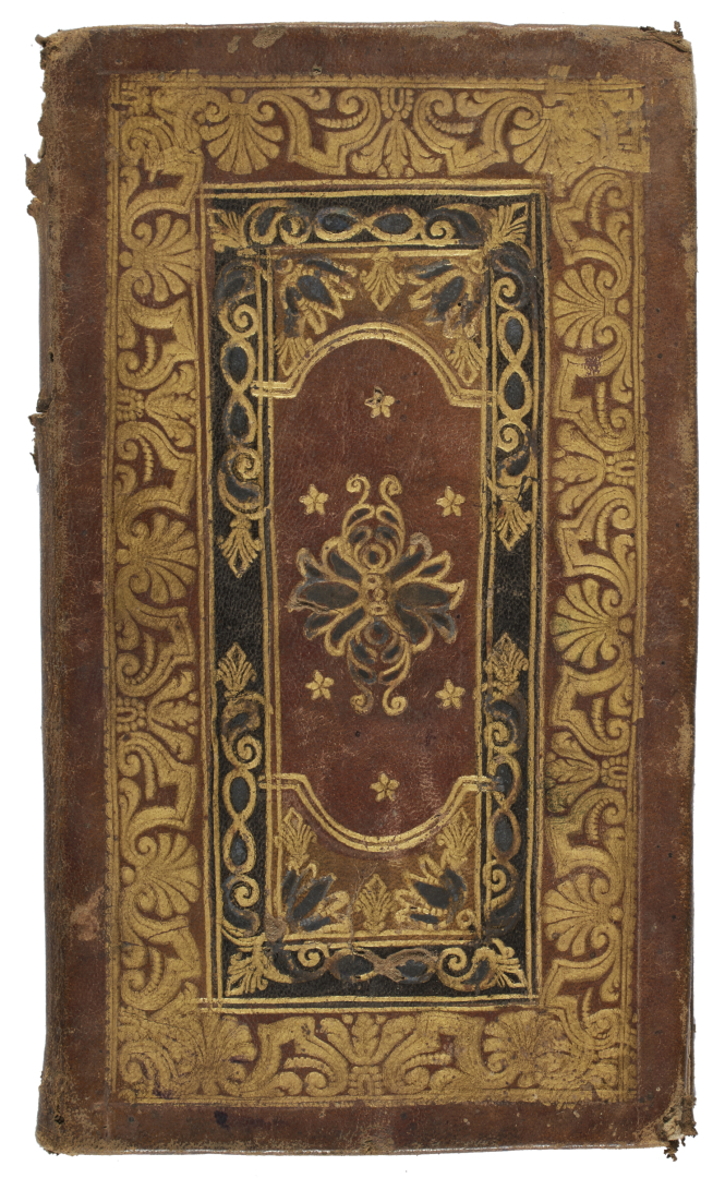 [Legatura]. Legatura del secolo XVIII (150 x 85 mm) in pelle color nocciola intarsiato in nero e oro che contiene Farnace, dramma per musica. Da rappresentarsi nel Real teatro di S. Carlo nel dì 4. novembre 1767, festeggiandosi il glorioso nome della S. R. C. M. di Carlo III. di Antonio Maria Luchini, volume stampato a Napoli da Francesco Morelli nel 1767, con la musica di Giuseppe Misliwecek.
