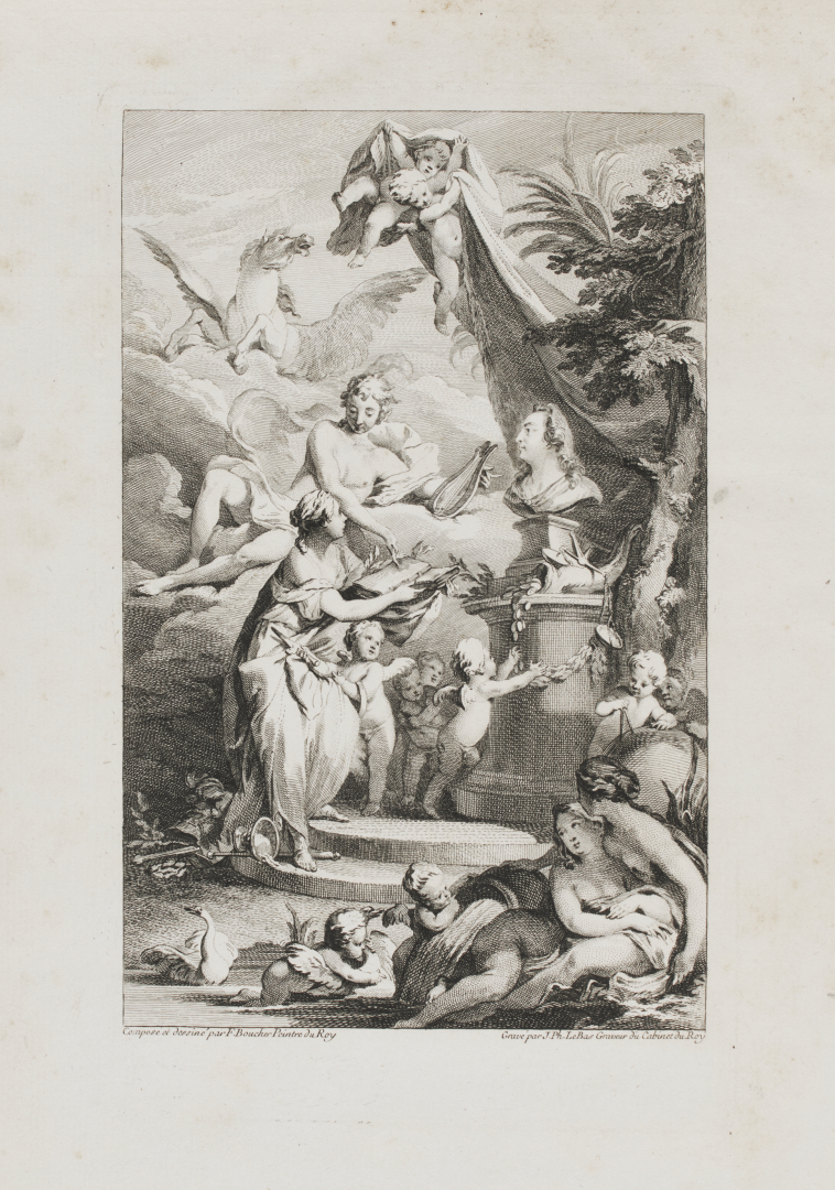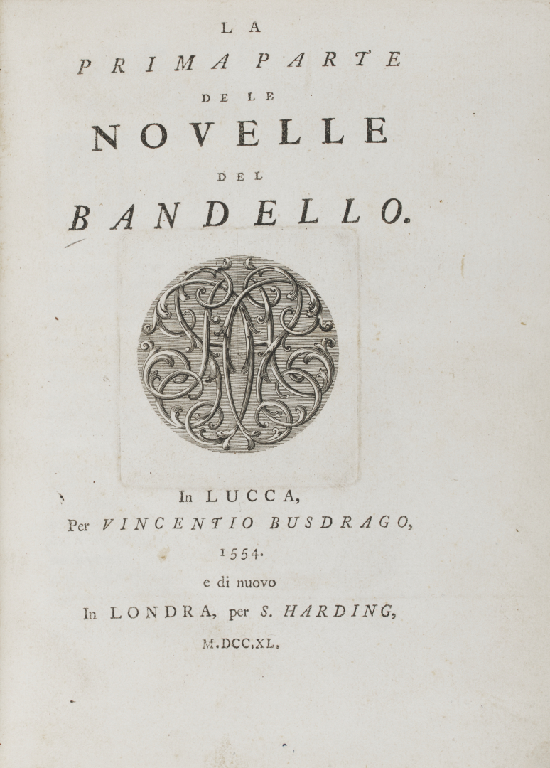 [Letteratura]. Esemplare fresco delle Oeuvres di Prosper Jolyot de Crébillon nell'edizione di Parigi presso l'Imprimerie Royale del 1750 in 2 volumi con antiporta calcografica al primo volume e vignetta calcografica ai frontespizi, entro legatura coeva in vitellino color nocciola con fregi fitomorfi e titolo su doppio tassello al dorso, unghiatura à dentelles, labbri dorati e tagli rossi (spellatura al piatto anteriore di un volume). Elegante edizione illustrata da Boucher in bella legatura. Il lotto è arricchito poi dall'edizione delle Novelle di Matteo Bandello nell'edizione di Lucca per Vincentio Busdrago del 1554, ma in realtà Londra per S. Harding del 1740 con 4 tomi legati in 3 volumi, marca tipografica ai frontespizi, entro legatura coeva in marocchino bordeaux con filettatura ai piatti, fleurons d'angle e fregi e titolo in oro al dorso, unghiatura à dentelles, tagli dorati (gran parte dei dorsi mancante).
