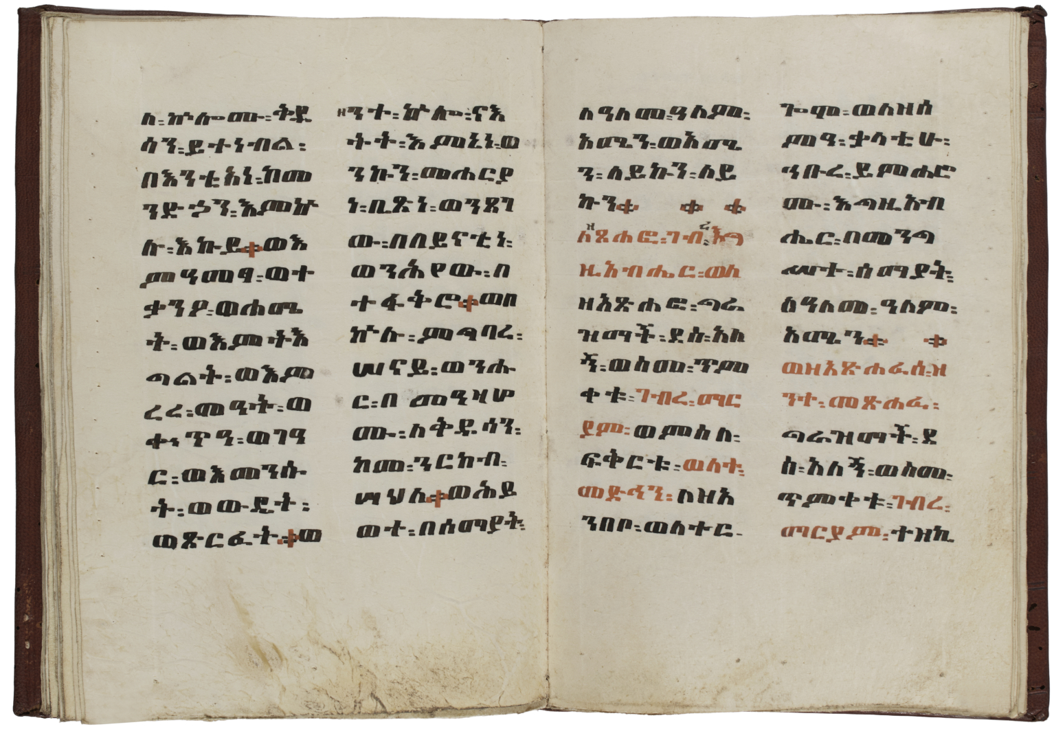 [Manoscritti - Etiopia]. Straordinaria coppia di manoscritti religiosi in Ge'ez, la lingua liturgica della Chiesa ortodossa d'Etiopia, risalenti probabilmente al XIX o XX secolo, entrambi realizzati con la tipica pergamena (beranna), trascritti su 2 colonne in nero e rosso, con tracce di rigatura a secco. Il primo (183 x 130 mm) consta di 34 fogli ed è rilegato in pelle rossa su assi di legno, con una grande croce e fregi decorativi impressi a secco ai piatti. Il secondo, più grande (220 x 200 mm), 144 fogli, è conservato entro busta originale in cuoio per il trasporto e ha legatura in pelle marrone su assi lignei, con 4 cornici decorate e una croce impresse a secco sui piatti. Due testimoni unici della longeva tradizione manoscritta etiopica.