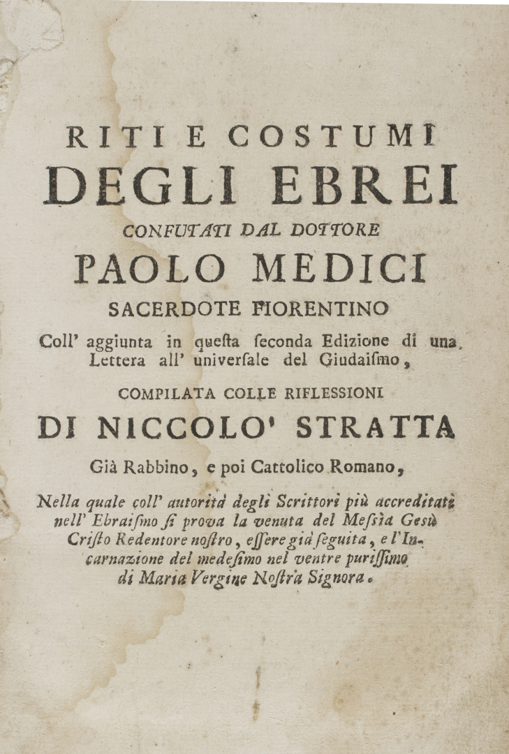 Medici, Paolo Sebastiano. Riti e costumi degli ebrei. Madrid, Luc'Antonio de Bedmar, 1738.