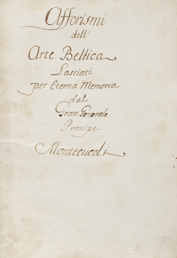 [Montecuccoli]. Interessante manoscritto cartaceo (250 x 190 mm) di 307 carte in scrittura cancelleresca di facile lettura che contiene una copia del secolo XVII/XVIII degli Afforismi dell'arte Bellica lasciati per eterna Memoria dal Gran Generale Principe Montecuccoli, entro legatura coeva in pergamena (mancanze in testa al dorso). Tutte le pagine sono reglé. Il manoscritto tratta gli aforismi in astratto - riflessi alle pratiche di guerra del 1661-63 - applicati alle Guerra possibile con i Turchi in Ungheria. L'opera ebbe varie edizioni. Celebre quella curata da Foscolo e tirata in soli 170 esemplari presso Mussi di Milano nel 1807.