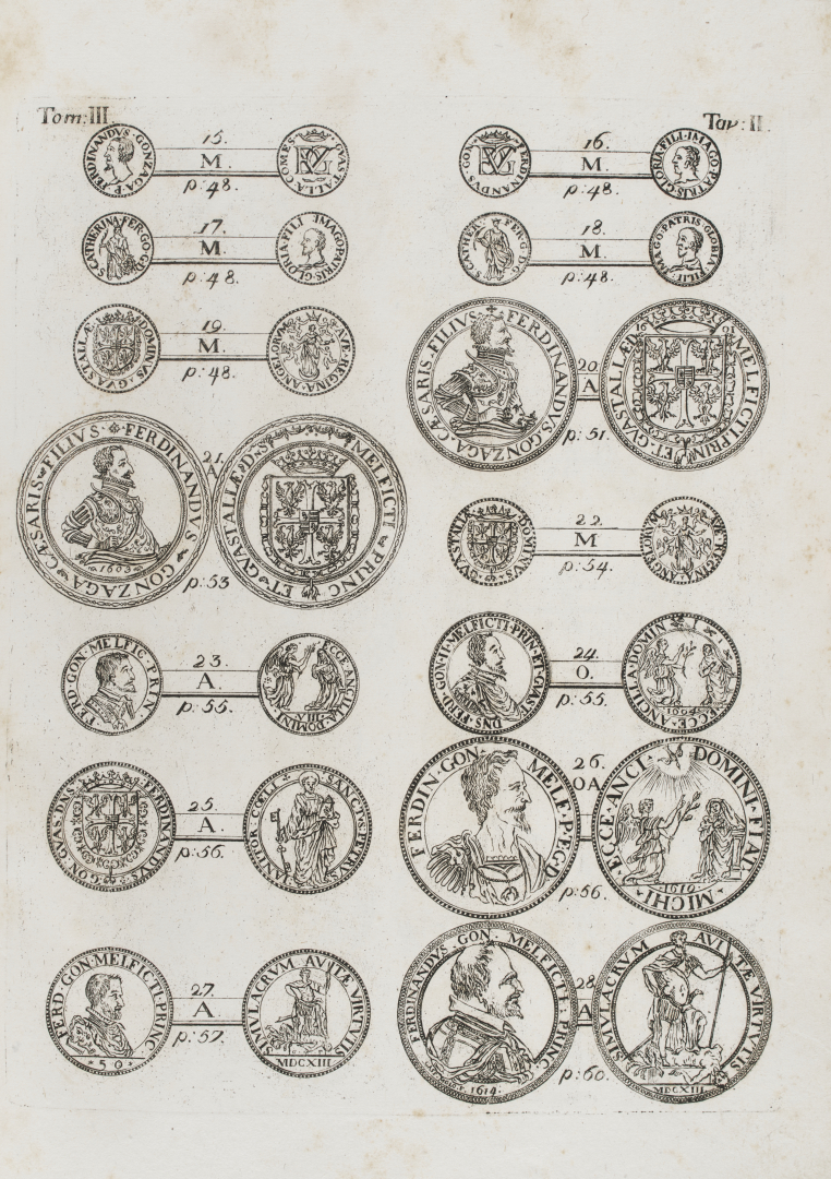 [Numismatica]. Interessante lotto che unisce 6 opere di numismatica: la prima ed unica edizione Delle zecche e monete di tutti i principi di casa Gonzaga che fuori di Mantova signoreggiarono di Ireneo Affò, stampata da Lelio dalla Volpe a Bologna nel 1782 con 19 tavole incise di cui 3 ripiegate, I discorsi del s. don Antonio Agostini sopra le medaglie et altre anticaglie divisi in 11 dialoghi tradotti dalla lingua spagnuola nell'italiana con la giunta d'alcune annotationi e molti ritratti di belle e rare medaglie si e messo di piu nel fine l originale spagnuolo, priva di data, ma del 1592 con ritratto dell'autore e numerose tavole, il Discorso di M. Sebastiano Erizzo del 1568, Della decima e delle altre gravezze della moneta, e della mercatura de' fiorentini fino al secolo XVI di Giovanni Francesco Pagnini del 1765, Ad numismata imperatorum Romanorum aurea et argentea a Vaillantio edita, a Cl. Baldinio aucta ex solius Austriae utriusque di Joseph Khell von Khellburg nell'edizione di Vienna del 1767, e il Prontuario delle medaglie de piu illustri, & fulgenti huomini del 1553 con 2 parti in 1 volume, entro legatura di poco posteriore in pelle spugnata con fregi e titolo in oro al dorso.