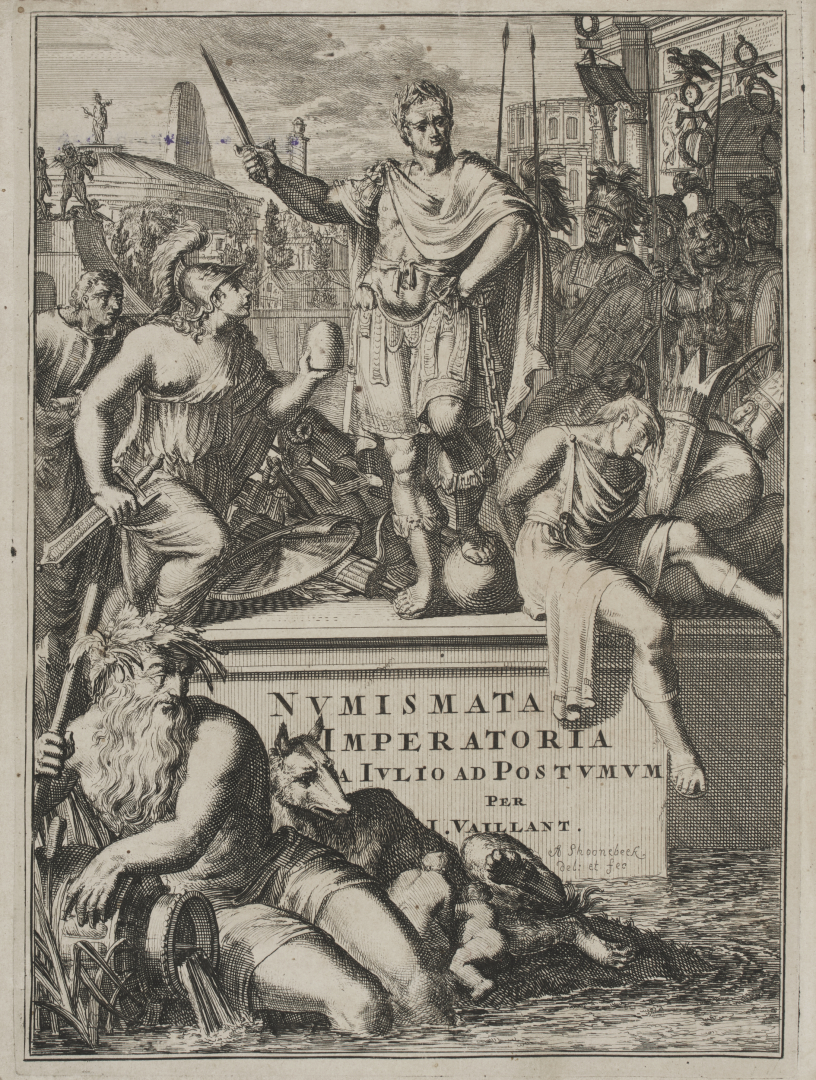 [Numismatica]. Terza edizione della pubblicazione Numismata Imperatorum Romanorum praestatiora a Julio Caesare ad tyrannos usque di Jean Foy Vaillant nell'edizione di Amsterdam di Gallet del 1694 con 2 parti in 1 volume, antiporta incisa ripetuta in entrambi parti e frontespizio stampato in rosso e nero. Numerose figure di monete romane nel testo, entro legatura coeva in bazzana con fregi dorati al dorso e tagli a spruzzo rossi.
