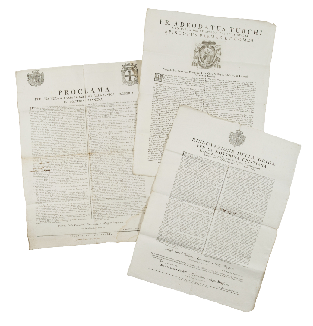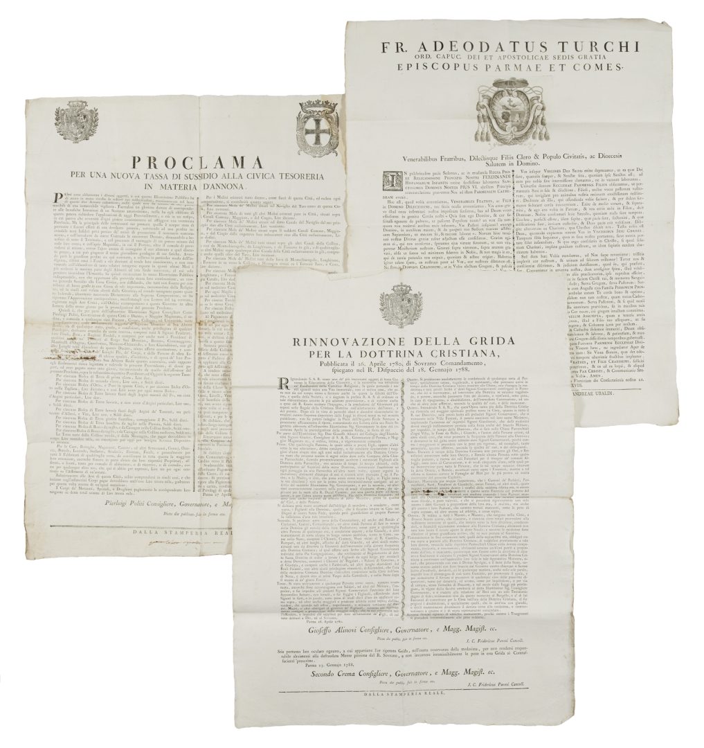 [Parma - Editti]. Corposo lotto di avvisi, editti, proclami ecc. legati al Ducato di Parma, Piacenza e Guastalla. Citiamo tra gli altri Proclama per una nuova tassa di sussidio alla civica tesoreria in materia d'Annona del 1801, Rinnovazione della grida per la dottrina cristiana, pubblicata il 26.aprile 1780, pubblicata il 23 gennaio 1788, e In pulchritudine pacis sedentes di Adeodato Turchi recante l'emissione del 21 settembre 1788.