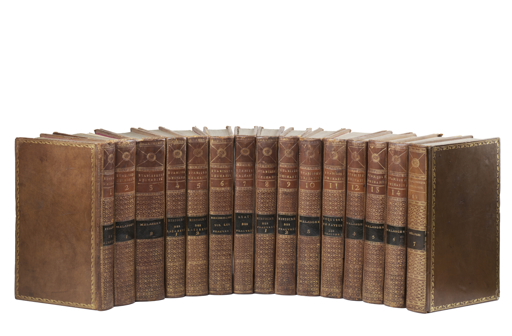 [Pauperismo]. Recueil de mémoires sur les établissemens d'humanité [Pauperismo] Rarissimo set completo del Recueil de mémoires sur les etablissemens d'humanité, stampato a Parigi da Henri Agasse e poi Agasse, Heinrich, Treuttel & Wurtz dal 1799 al 1804, con 39 parti e numerazione autonoma, contenenti numerose tabelle sinottiche, entro bella legatura in piena pelle coeva con cornice in oro ai piatti, dorsi fittamente ornati con titoli e fregi in oro a motivi geometrici di gusto neoclassico. Impressionante raccolta, unica nel suo genere a livello europeo, contenente saggi e studi sul pauperismo e sulle maggiori istituzioni "caritatevoli", diffuse soprattutto in Gran Bretagna e in Germania, realizzate negli ultimo decenni del XVIII secolo, dalle "work houses" agli stabilimenti penitenziari, dalle colonie agricole agli orfanotrofi e alle case per i minori, per sopperire alle necessità dei ceti più poveri delle campagne e delle città nel delicato passaggio verso la prima rivoluzione industriale.