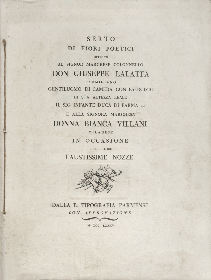[Pernozze]. Piccolo insieme di pernozze stampate da tipografie di Parma come Paganino, Amoretti e Carmignani che usano caratteri bodoniani o si ispirano a caratteri e fregi di Bodoni. Citiamo Per le nozze del signor Giammaria Tagliasacchi di Borgo S. Donnino colla signora Maria Fulcini di Busseto versi di Gaspare Ortalli parmigiano, volume stampato a Parma da Giuseppe Paganino nel 1820, il Canto epitalamico del dottore Vincenzo Cotenna lucchese nelle nozze dell'ornatissimo uomo Paolo Garzoni lucchese coll'inclita donzella Carolina Venturi fiorentina nell'edizione genovese del 1801, e il Serto di fiori poetici offerto al signor marchese colonnello don Giuseppe Lalatta parmigiano ... e alla signora marchesa donna Bianca Villani milanese in occasione delle loro faustissime nozze, stampato dalla Tipografia parmense nel 1785.