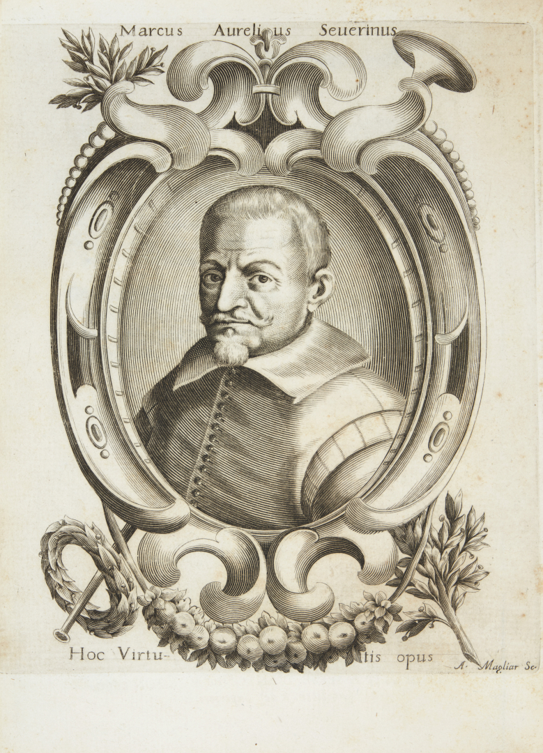In miscellanea con: Severino, Marco Aurelio. La filosofia overo Il perche degli scacchi per cui chiaramente si mostra prima l'artificio della fabrica universale. Napoli, Antonio Bulifon, 1690. In 4° (208 x 145 mm). Prima opera: [8], 82 [ma 64], [4] pagine; seconda opera: [8], 120 pagine. Entrambi volumi con ritratto dell'autore in antiporta (2 carte dell'Introduzione nella prima opera in facsimile, leggermente brunito.) Legatura coeva in pergamena con titolo manoscritto in verticale al dorso. Ex libris e tassello della libreria antiquaria Mediolanum, Milano.