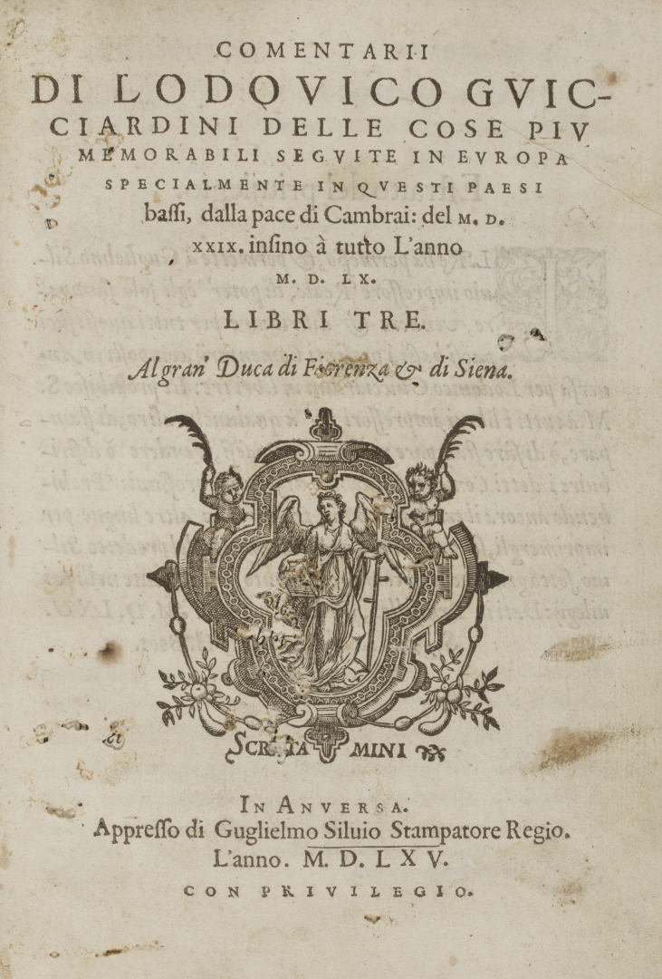 [Storia]. Guicciardini, Lodovico. Comentarii ... delle cose piu memorabili seguite in Europa specialmente in questi Paesi Bassi, dalla pace di Cambrai. Anversa, Willem Silvius, 1565.