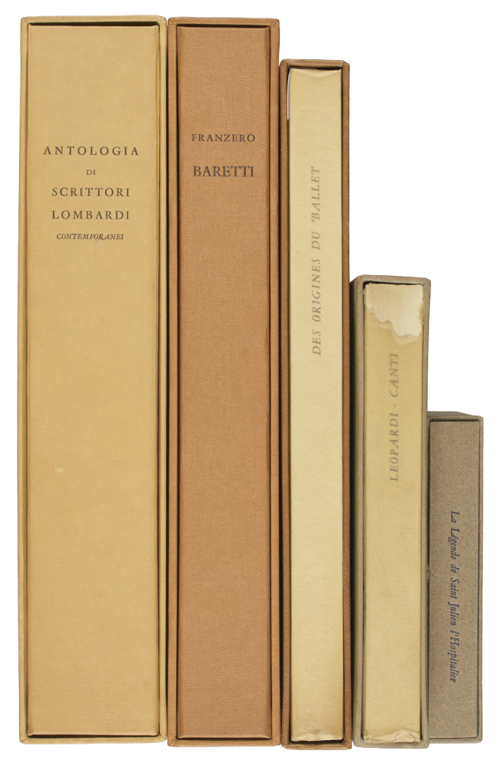 [Tallone]. Piccolo gruppo che contiene l'esemplare no. 178 dell'Antologia di scrittori lombardi contemporanei di Tallone del 1961, l'esemplare no. 403 del Gentiluomo piemontese a Londra di Baretti del 1965 con grande veduta panoramica di Londra, Des origines du ballet di Ferdinando Reyna nell'edizione di Parigi di Tallone del 1955, un esemplare su carta Rives dei Canti di Giacomo Leopardi del 1956, e La légende de saint Julien l'hospitalier di Gustave Flaubert del 1945.