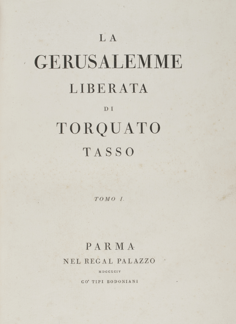 [Tasso]. Corposo lotto che contiene tra gli altri un esemplare marginoso de La Gerusalemme liberata di Tasso nell'edizione bodoniana del 1794, il testo nell'edizione di Bassono presso Remondini, l'Aminta favola boschereccia di Tasso dell'edizione di Crisopoli del 1796 entro legatura bodoniana in cartonato arancione, e Il secretario, et il primo volume [-il secondo volume] delle Lettere familiari di Tasso nell'edizione di Altobello Salicato del 1596.