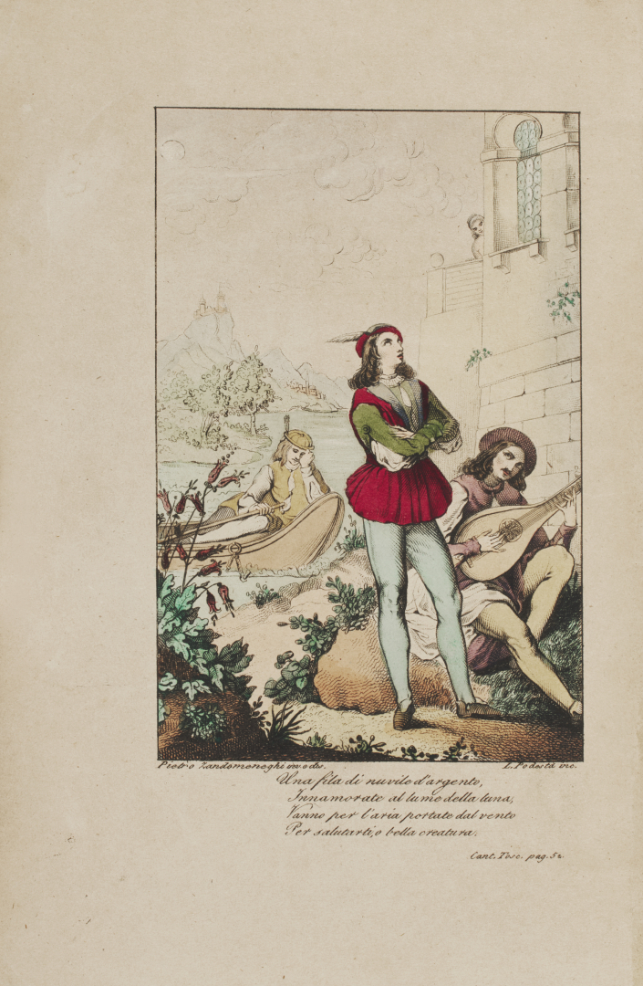 [Tommaseo]. Prima edizione dei Canti popolari toscani, corsi, illirici, greci ... con opuscolo originale del medesimo autore di Niccolò Tommaseo nell'edizione veneziana  di Girolamo Tasso del 1841-42 con 3 antiporta di cui la prima colorata a mano, entro legatura di inizio secolo XX in mezza pergamena con angoli, frego dorati e titolo su doppio tassello al dorso. L'antologia accoglie un insieme di prose e poesie in diverse lingue, quali l'italiano, il francese, il latino e il greco, esemplare completo dell'opuscolo Scintille nel quinto volume.