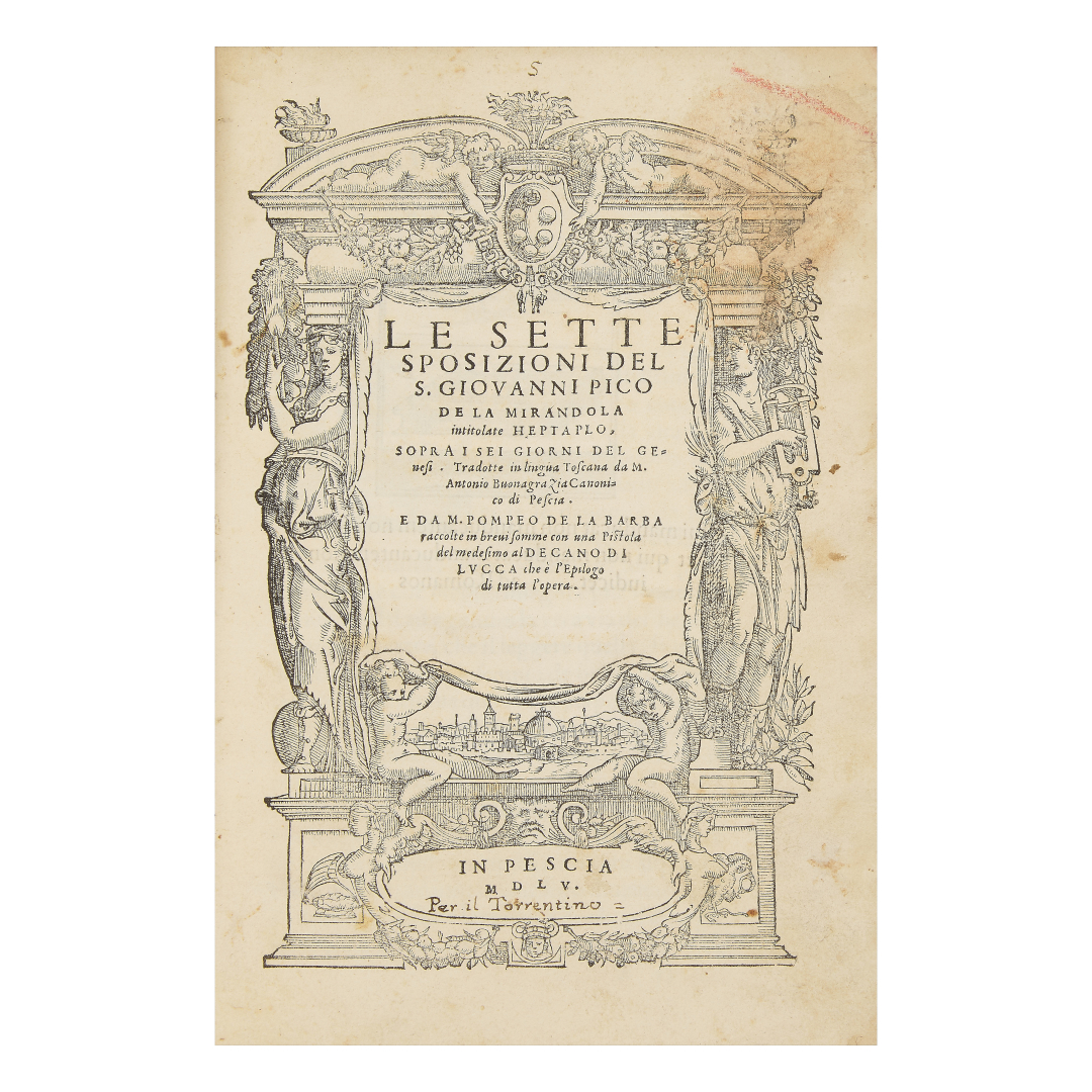 Prima edizione italiana della più importante opera di Pico sui significati filosofici e cabalistici del libro della Genesi, elaborata grazie alla sua profonda conoscenza della lingua ebraica, delle teorie di Platone e Aristotele e della scolastica medievale. Variante B, con l'indicazione di Pescia al colophon e la correzione al rigo 1 della p. 65. Il lotto include, inoltre, Laurentii Vallae Elegantiarum libri carmine nuper perstricti, edito a Torino da Francesco Dolce nel 1573, entro legatura coeva in pergamena con titolo manoscritto al dorso; il Dictionnaire abrégé de la Bible, Parigi 1755, e il settimo tomo dell'edizione parigina dell'Histoire du Monde par M. Chevreau del 1717.