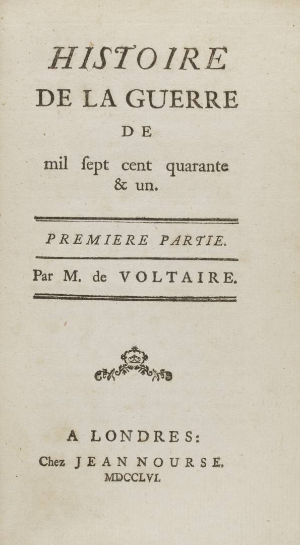 [Voltaire]. Interessante lotto dedicato a Voltaire, con un esemplare con barbe de L'Homme aux quarante écus del 1768 con frontespizio entro cornice figurata e 98 pagine, un esemplare con barbe de Le duc de Foix del 1753, la prima edizione de Mahomet nell'edizione di Bruxelles del 1742, Bengesco 131, La princesse de Navarre nell'edizione di parigi di Ballard del 1745, Oreste nell'edizione di Parigi di Le Mercier e Lambert del 1750, Histoire de la guerre nell'edizione londinese di Jean Nourse del 1756, e Traité sur la tolérance del 1764 con IV, 210 pagine, edizione verosimilmente stampata da Machuel a Rouen, Bengesco 1693, 3.