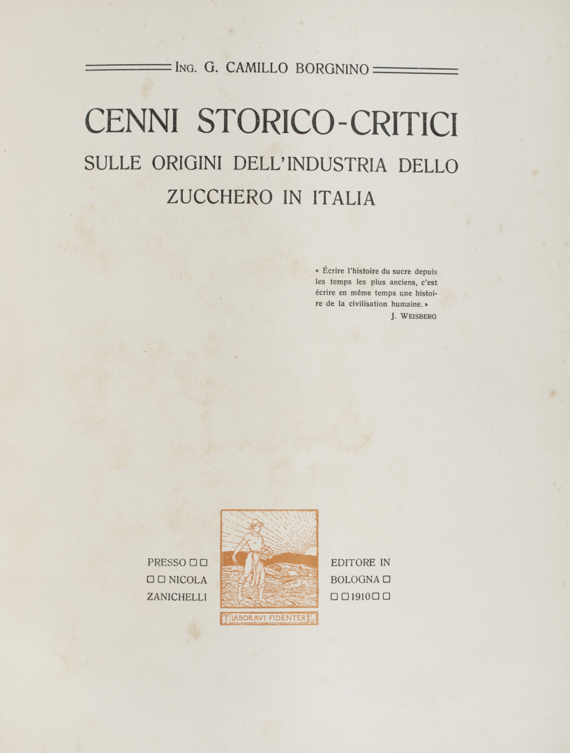 [Zucchero - Borgnino]. Lotto che contiene la prima edizione dei Cenni storico-critici sulle origini dell'industria dello zucchero in Italia di Camillo Borgnino del 1910 in esemplare con la dedica autografa dell'autore a Vittorio Emanuele III, entro legatura in pelle con le brossure editoriali incluse. Nel lotto anche qualche documento di corrispondenza dell'autore che dimostra il suo interesse nello sviluppo della produzione dello zucchero in Italia. Borgnino (1865-1940) è stato un chimico e figura importante per l'industria saccarifera italiana, noto per aver promosso gli zuccherifici di Molinella e Cento.