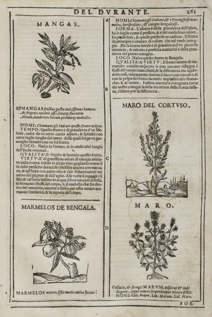 [Botanica]. Copia di studio dell'Herbario novo ... Con figure, che rappresentano le vive piante, che nascono in tutta Europa & nell'Indie orientali, & occidentali. Con versi latini, che comprendono le facoltà de i semplici medicamenti. Con discorsi, che dimostrano i nomi, le spetie, la forma, il loco, il tempo, le qualità, & le virtù mirabili dell'herbe di Castore Durante nell'edizione di Hertz del 1667, entro legatura in pergamena. Il volume con grande vignetta incisa al frontespizio stampato in rosso e nero contiene numerosissime figure di piante, ma con carte iniziali staccate e blocco del testo quasi staccato. Le piante, raffigurate con piccole ma ben definite xilografie, sono disposte in ordine alfabetico in base al loro nome italiano. Nel lotto anche l'Historia naturale di C. Plinio Secondo. Nuovamente tradotta di latino in vulgare toscano per Antonio Brucioli nell'edizione di Alessandro Brucioli e fratelli del 1548, mancante del frontespizio.