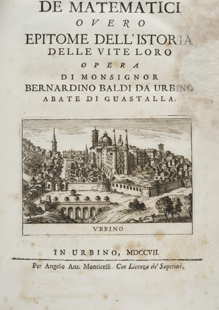 [Matematica]. Baldi, Bernardino. Cronica de matematici overo Epitome dell'istoria delle vite loro. Urbino, Monticelli, 1707.