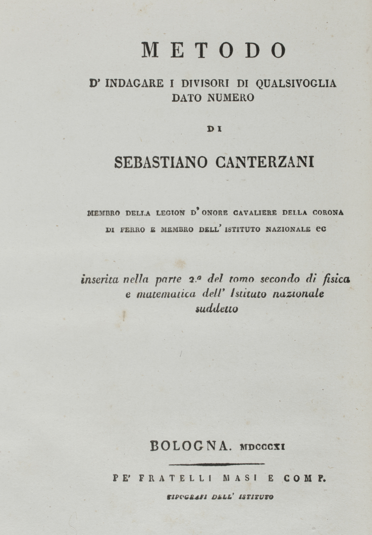 [Matematica]. Esemplare marginoso della prima edizione Teoria delle superficie di secondo ordine di Gaetano Giorgini nell'edizione lucchese del 1817 in miscellanea con De' reciproci delle formole irrazionali, opera pubblicata senza indicazioni di stampa, e con un esemplare su carta azzurrina del Metodo d'indagare i divisori di qualsivoglia dato numero di Sebastiano Canterzani del 1811. Canterzani fu professore di matematica all'università di Bologna. I suoi numerosi studi riguardarono soprattutto l'analisi matematica. Si interessò anche di astronomia e partecipò al gruppo di studio che il 6 giugno 1761 calcolò l'orbita di Venere.