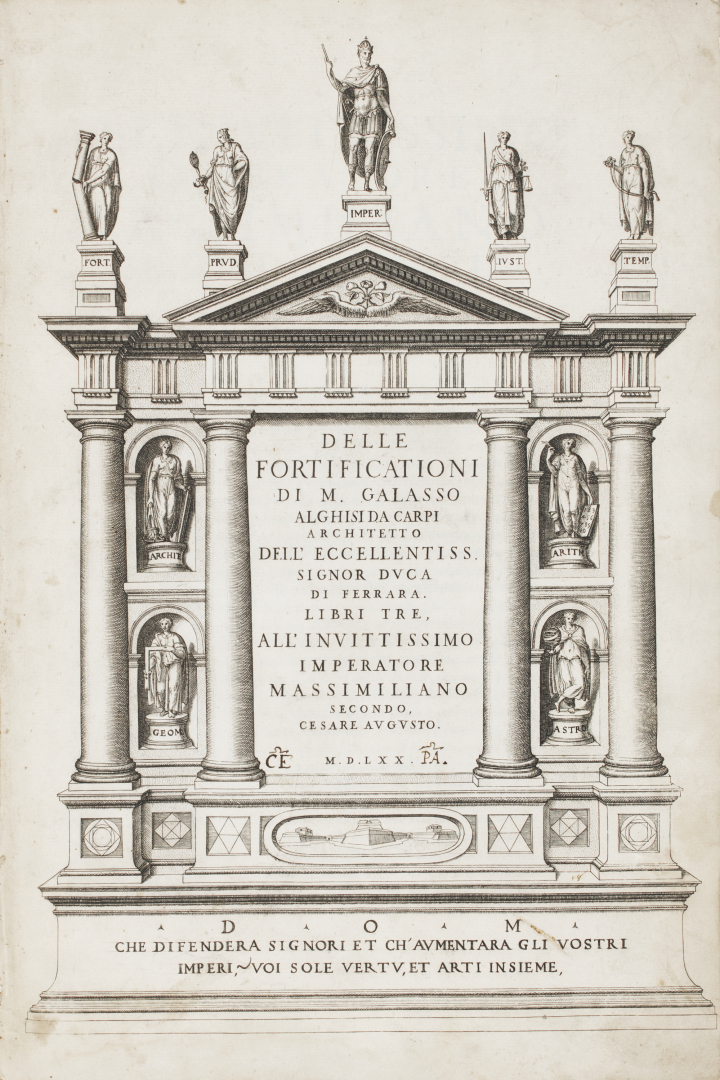 Prima edizione di questo trattato di architettura militare definito da Horst de la Croix, 1963 "one of the most beautifully printed treatises on military architecture of the entire century". L'opera è divisa in tre libri, dedicati rispettivamente ai metodi di costruzione, alla progettazione degli edifici e alla selezione dei siti e dei materiali. Alghisi lavorò per Ercole II e Alfonso II d'Este, costruendo chiese, teatri e fortificazioni. Adottò un approccio teorico alla progettazione delle fortezze, con un numero crescente di bastioni per difendersi dai cannoni, rendendo i bastioni più bassi, più spessi e adatti a contenere cannoni.