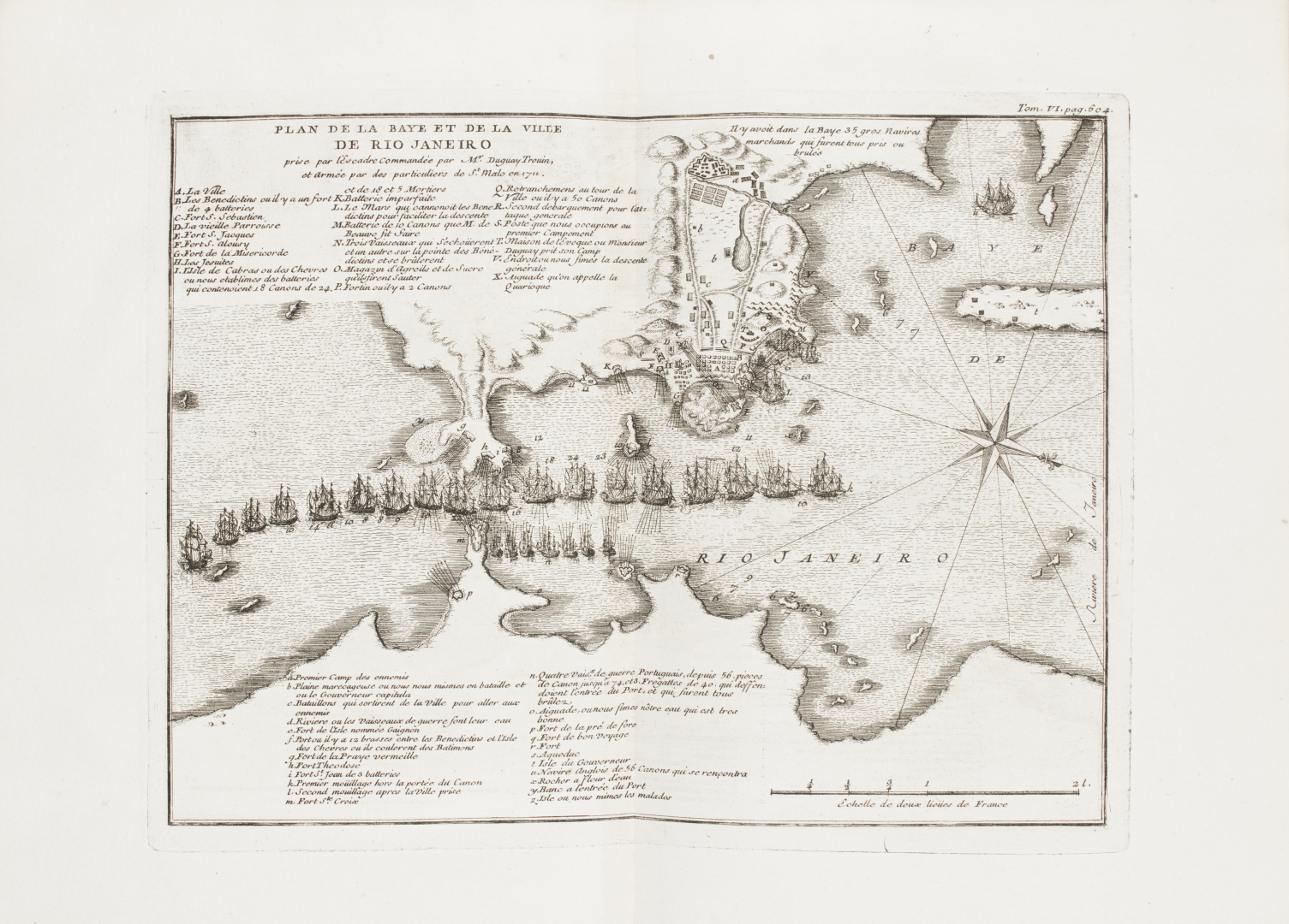 Esemplare fresco di questa prima ed unica edizione, completo dell'ottavo volume intitolato Maximes et instructions sur l'art militaire. Brunet IV, 1020: "Cet ouvrage est recherche des militaires, et ne se trouve pas facilement". Tra le città raffigurate segnaliamo Lussemburgo, Maastricht, Arras, Lille, Namur, Barcellona e la famosa battaglia di Rio de Janeiro del 1711, un raid compiuto nel settembre del 1711 sul porto di Rio de Janeiro durante la guerra di successione spagnola da uno squadrone francese al comando di René Duguay-Trouin.