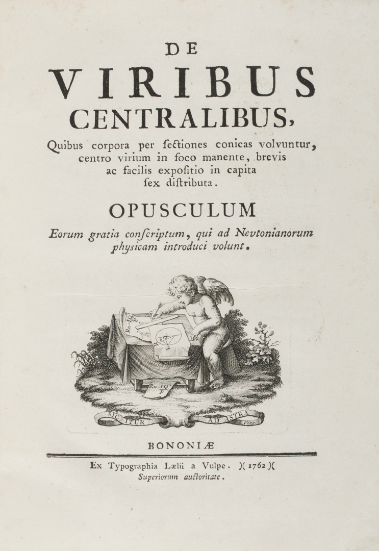 [Newton]. Esemplare fresco e marginoso della prima edizione De viribus centralibus, quibus corpora per sectiones conicas volvuntur, centro virium in foco manente, brevis ac facilis expositio in capita sex distributa, stampata a Bologna da Lelio Dalla Volpe nel 1762 con vignetta incisa al frontespizio e 3 tavole incise e ripiegate in fine volume. Nell'opera l'autore espone secondo una prospettiva relativamente originale la teoria newtoniana dell'attrazione.