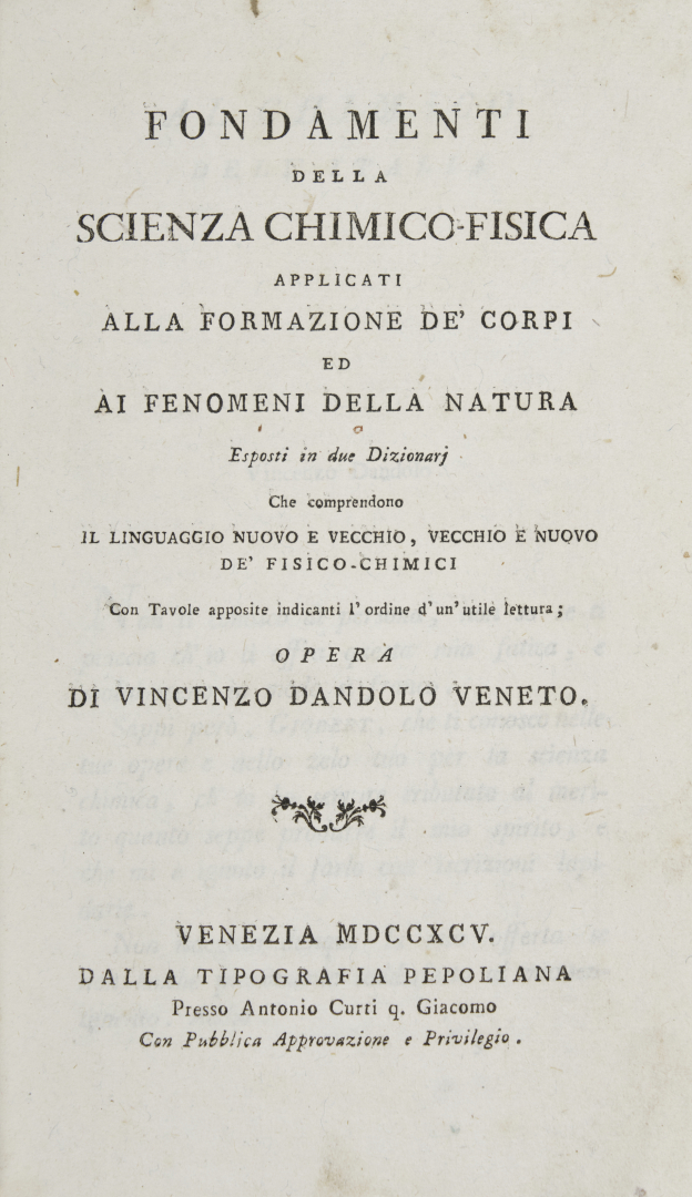 Prima edizione collettiva delle scoperte di Bernard Palissy (1510-1589) sulle strutture della terra, sull'alchimia, sui metalli, sulle pietre, ecc "revues sur les exemplaires de la bibliotheque du roi, avec des notes; par M. Faujas de Saint Fond, et des additions par M. Gobet". Come indicato da Brunet IV, 320, il volume si presenta senza il ritratto e l'epistola dedicatoria a Benjamin Franklin cancellati prima della pubblicazione che sono quasi sempre assenti. Nel lotto anche un esemplare fresco dei Fondamenti della scienza chimico-fisica applicati alla formazione de' corpi ed ai fenomeni della natura di Vincenzo Dandolo nell'edizione veneziana della tipografia Pepoliana nel 1795, entro legatura coeva in mezza bazzana con fregi fitomorfi e titolo in oro su tassello al dorso. In quest'opera l'autore sostenne e diffuse le teorie di Lavoisier.