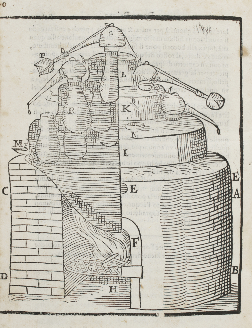 In 4° (184 x 135 mm); [20], 504 pagine. Grande vignetta con veduta di città al frontespizio, 3 figure xilografiche raffiguranti forni per la distilazione a piena pagina nel testo (piccoli difetti.) Legatura coeva in pelle con fregi dorati al dorso (piccola menda al dorso, blocco del testo quasi staccato).