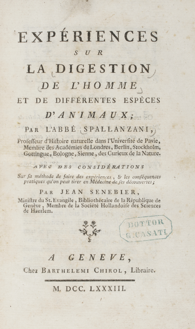 [Spallanzani]. Esemplare fresco della prima edizione francese del volume Expériences sur la digestion de l'homme et de différentes espèces d'animaux par l'abbé Spallanzani, stampata da Chirol a Ginevra nel 1783, entro legatura coeva in mezza pelle con angoli e titolo in oro al dorso. Contiene le ampie osservazioni di Senebier delle celebri sei dissertazioni sopra la digestione umana e animale. L'opera viene considerata "come una delle più importanti opere fisiologiche della nuova era della biologia e come uno degli esempi più belli di 'lavoro' sperimentale (Montalenti, pagine 299-300).